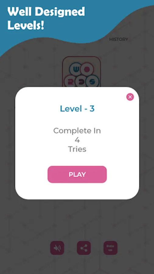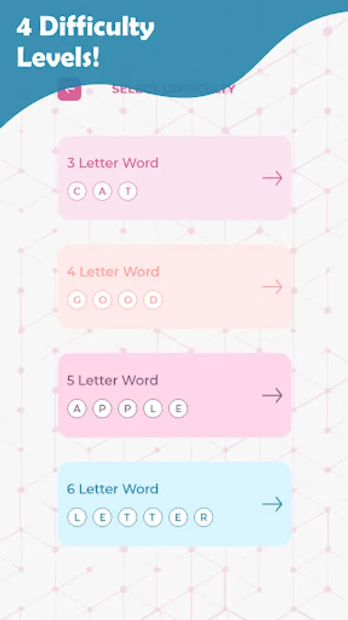 A player can select how many letter words they want to create in the game, such as 3 letter words, 4 letter words, 5 letter words, 6 letter words etc. In this game, the level is determined by the number of attempts given to the players.
