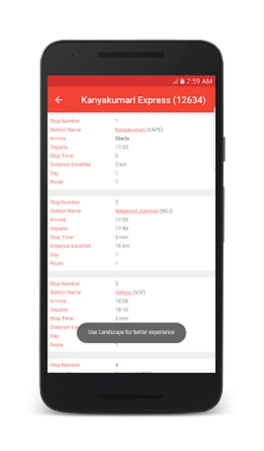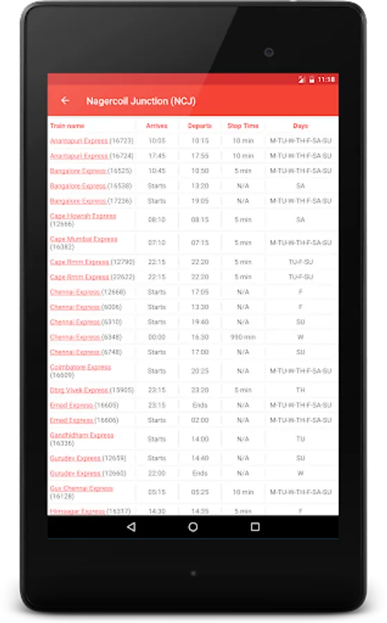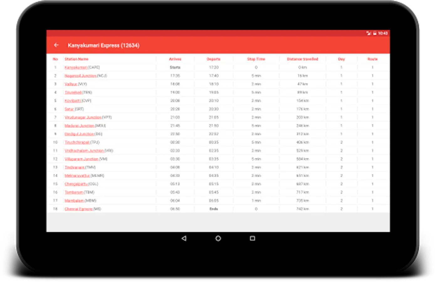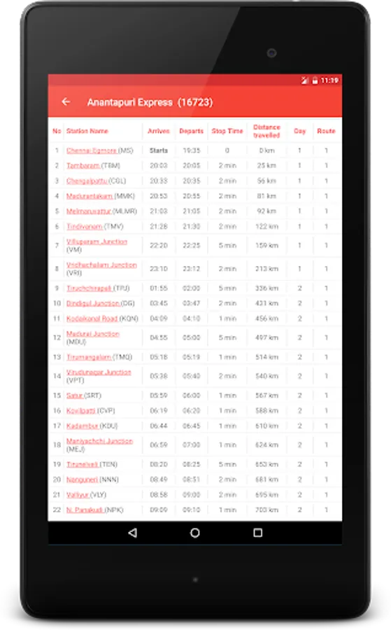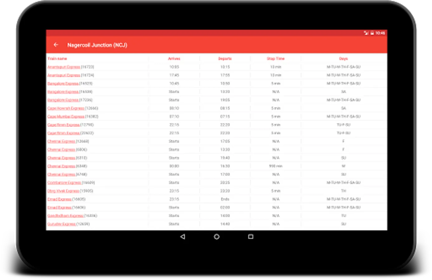 * Search details of all railway stations in India(You can see details like no.of trains passing via, Arrival and Departure time, Stop time, Available days, etc) .