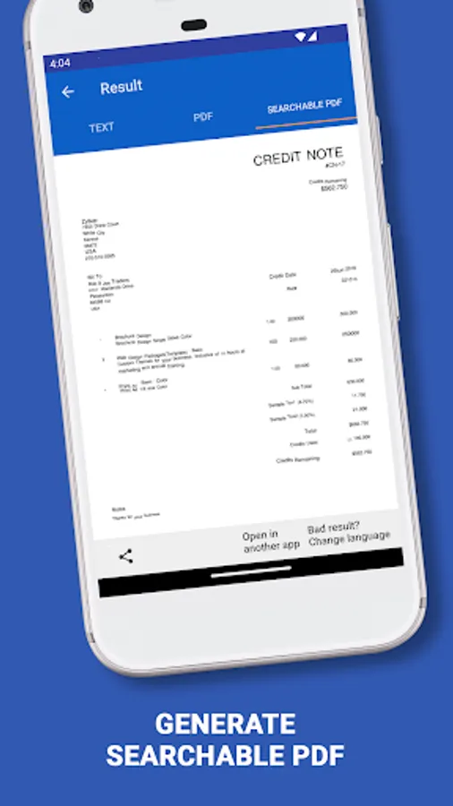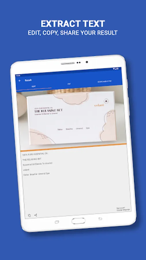 Photo Scanner. Get result as plain text or searchable PDF. Edit and share.