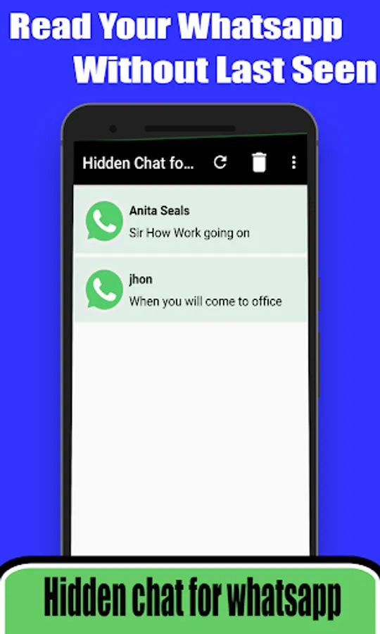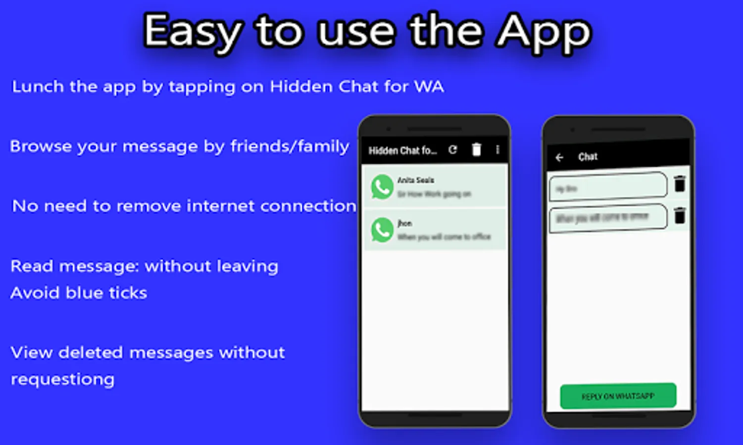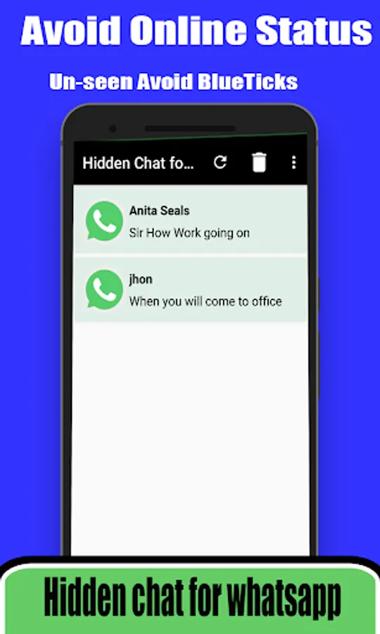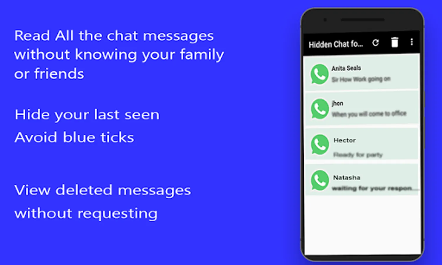 Hidden Chat for WhatsApp is a simple application to read your incoming WhatsApp messages and sending messages without appearing online and without showing blue ticks anymore.