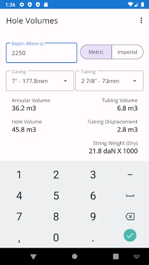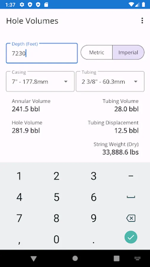 *These numbers will be very close, but due to pipe weights and make, volumes may be slightly off. The app uses the most commonly used casing and pipe weights to calculate the volumes.