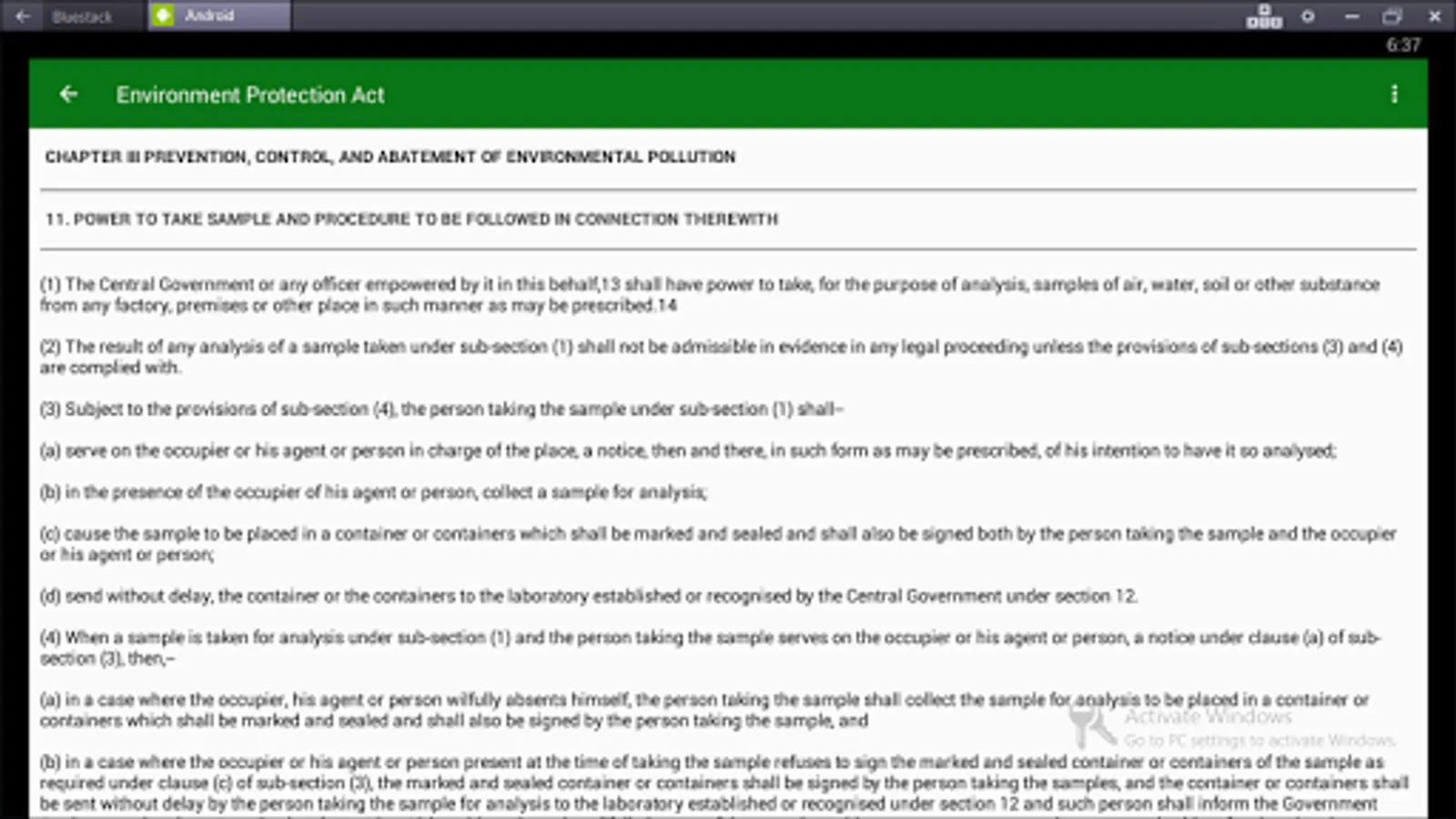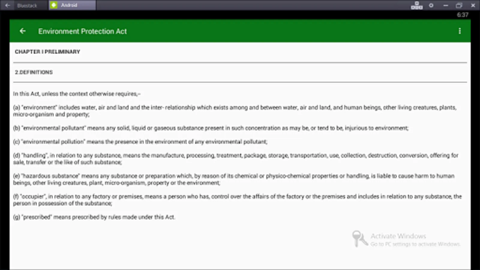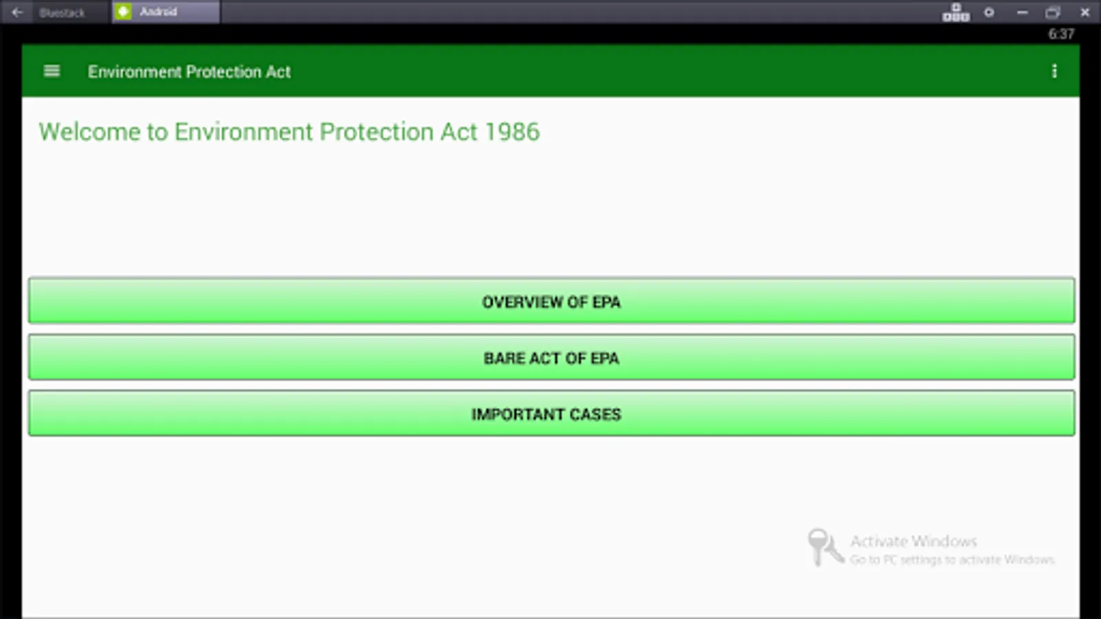 This app is design for the student. It have all the materials which required to a student. It is divided into three parts in which first part contains the overview of the environment protection Act and the second part contains the bare act of environment protection act with latest amendment and the last part contains the relevent case laws.