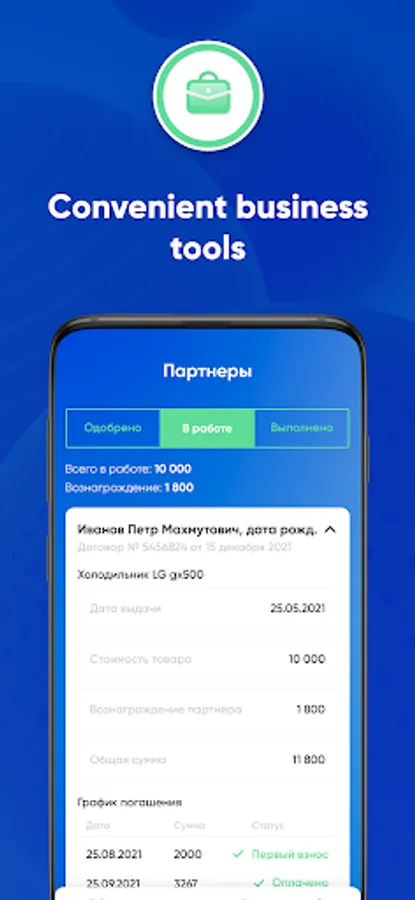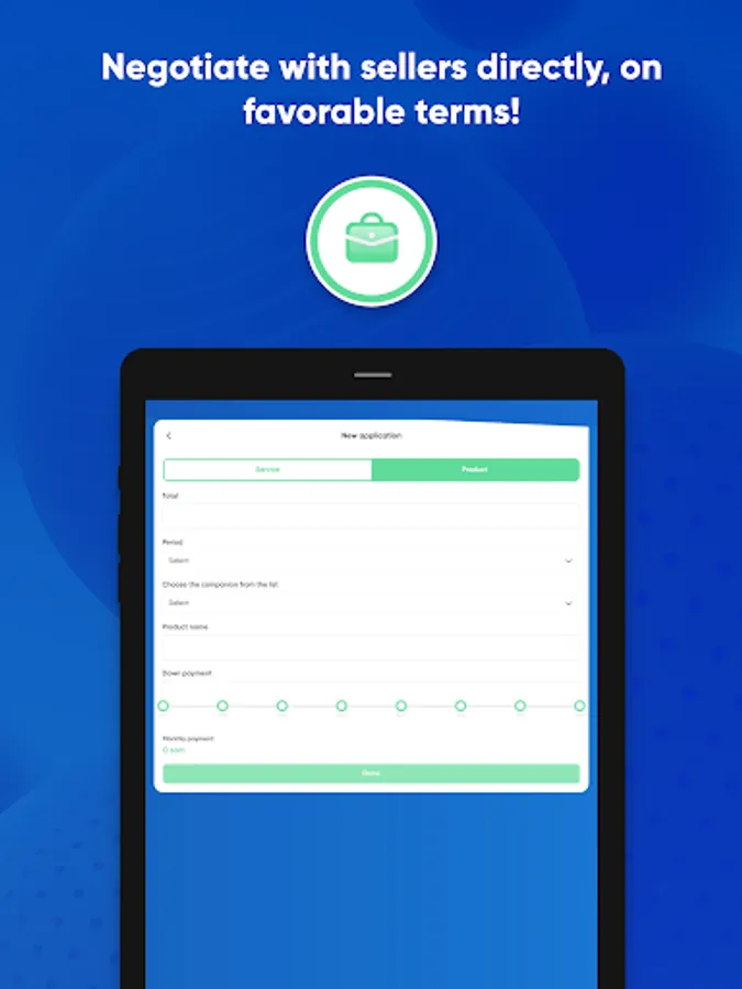 - the buyer goes through the registration procedure only once by filling out an online questionnaire and passing the scoring procedure. After, the client can make deals with transactions by sending an application with conditions convenient for him.