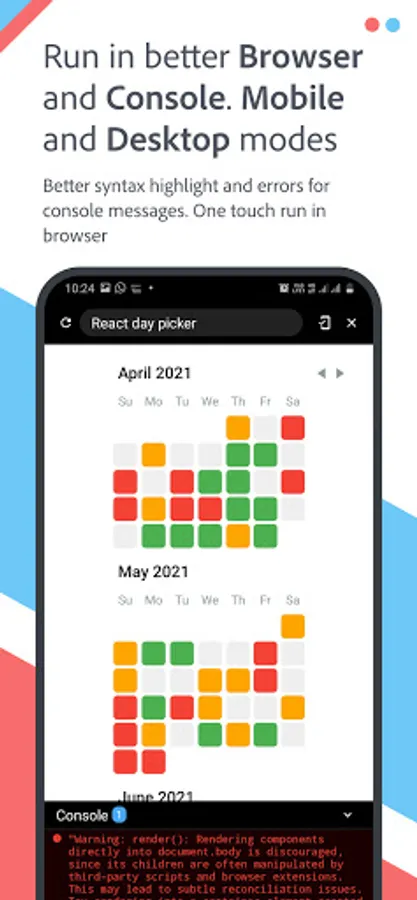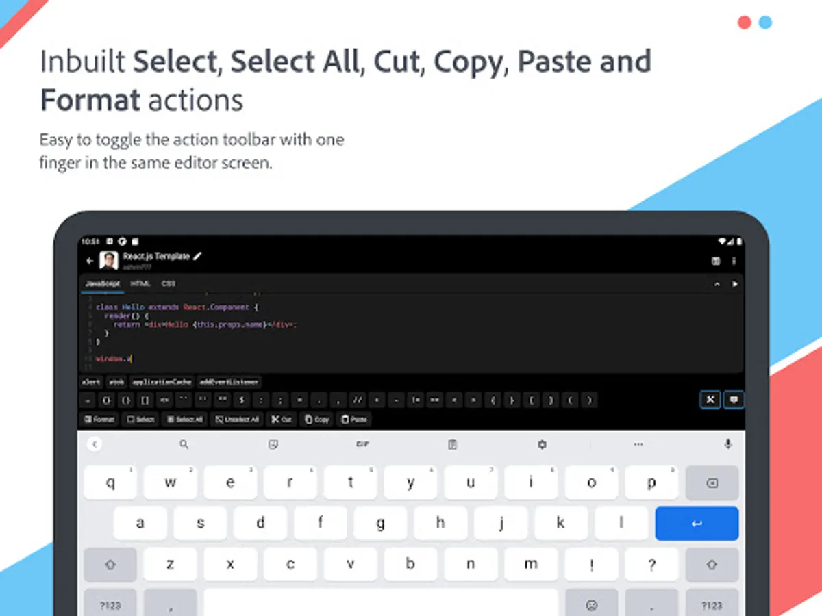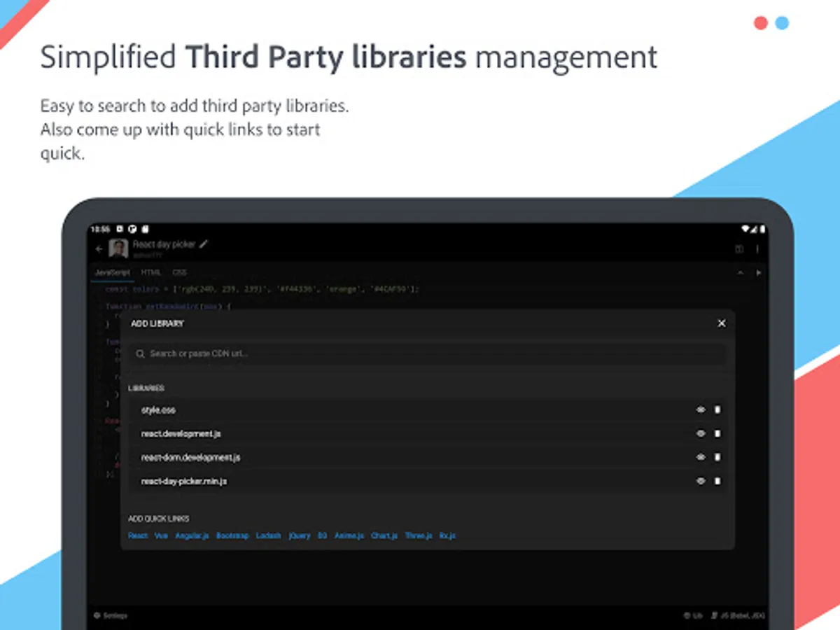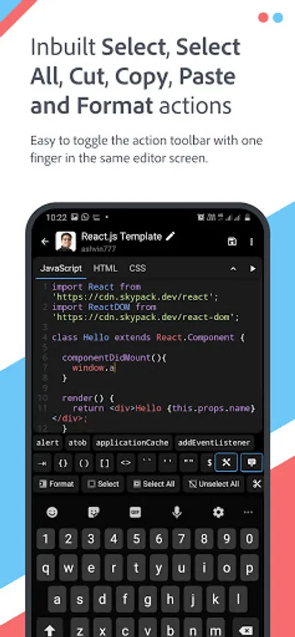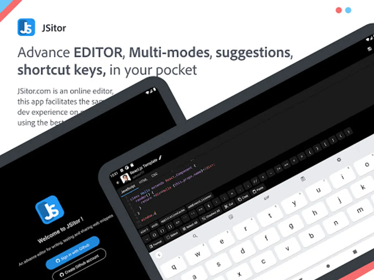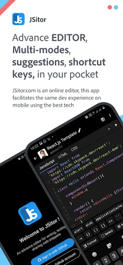 An advanced editor to write, test and share JavaScript, CSS, and HTML snippets in mobile phones and tablets. Below are the main features -