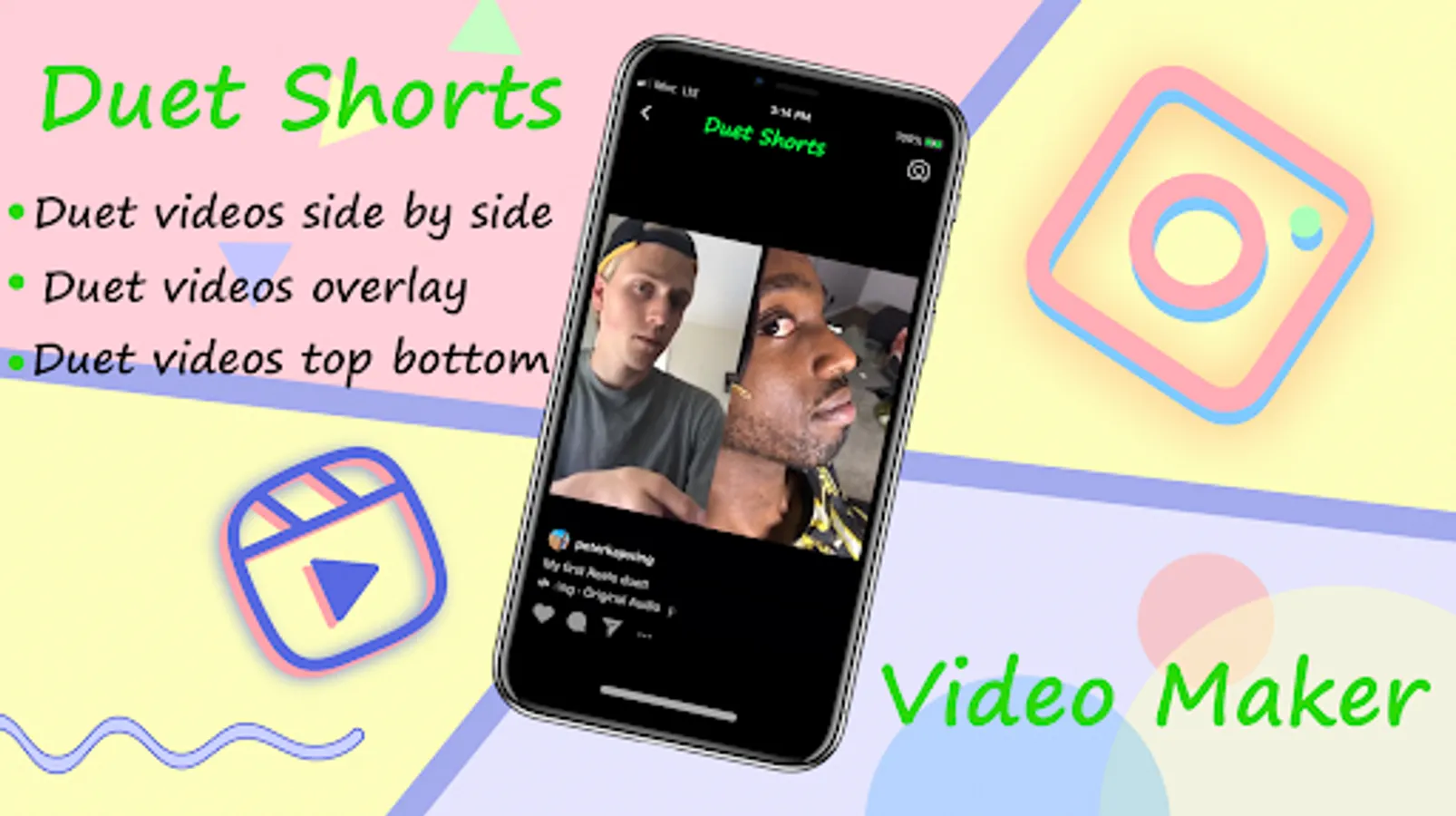 -Duet video maker side by side, cascade overlay and top bottom video editing and display.