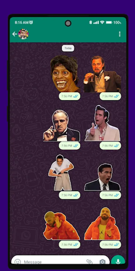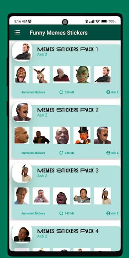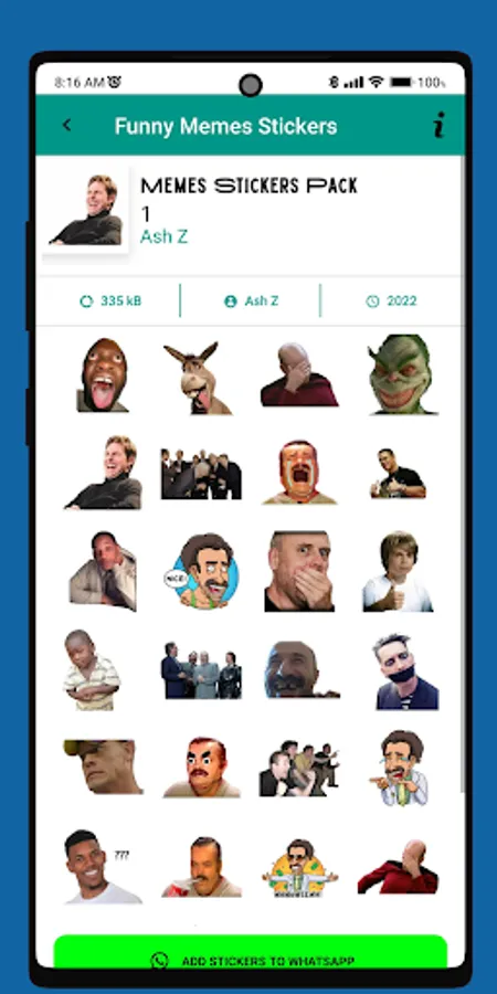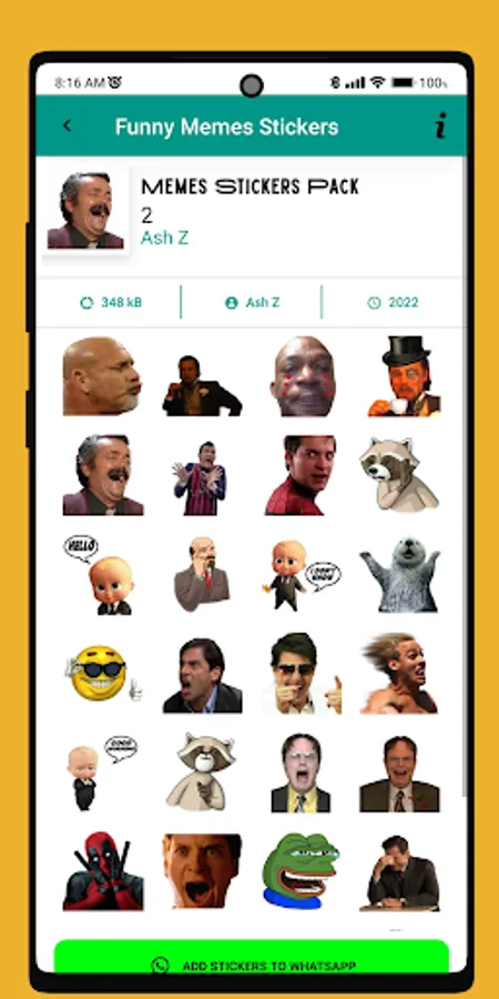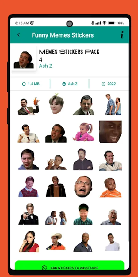 This App contains all kinds of memes stickers ordered in different categories, babies stickers, love stickers and more.