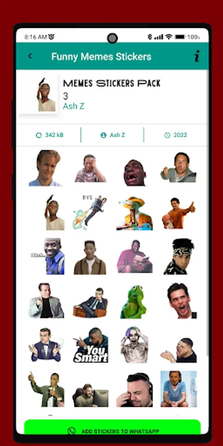 1) open the meme stickers app on your phone, select a sticker pack and tap add to WhatsApp.