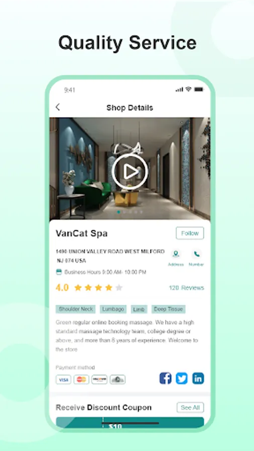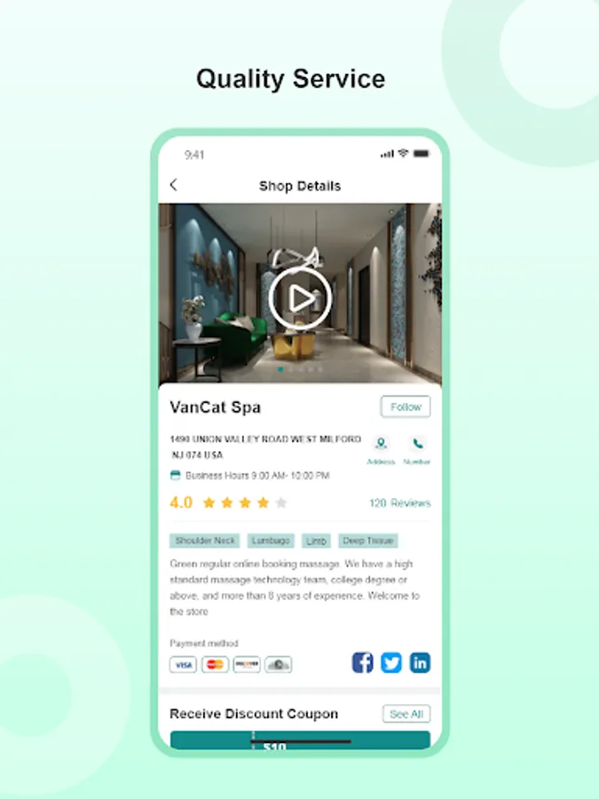 Welcome to our in-store massage App! We are a professional massage service provider, dedicated to providing you with high quality massage services to help you relax, relieve stress, improve health and happiness.