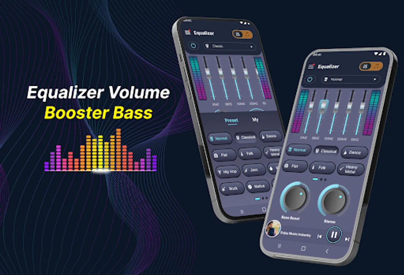 Equalizer Volume Booster Bass helps you adjust music effects and video sound quality with equalizer FX, bass booster, volume booster, 3D visualizer effects and enjoy extra loud sound. No need to use headphones or speakers, you can enjoy great music with Equalizer Volume Booster Bass.