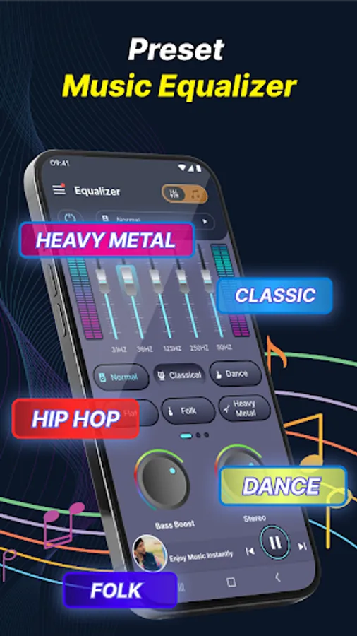 - Equalizer presets for your choice: Normal, Rock, Dance, Pop, Heavy, Flat, Jazz, Hip Hop, Folk, R&B, and etc.