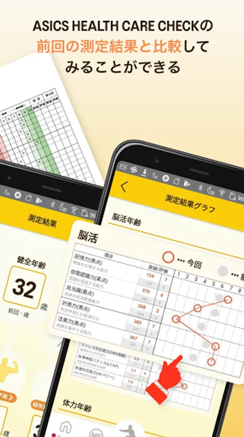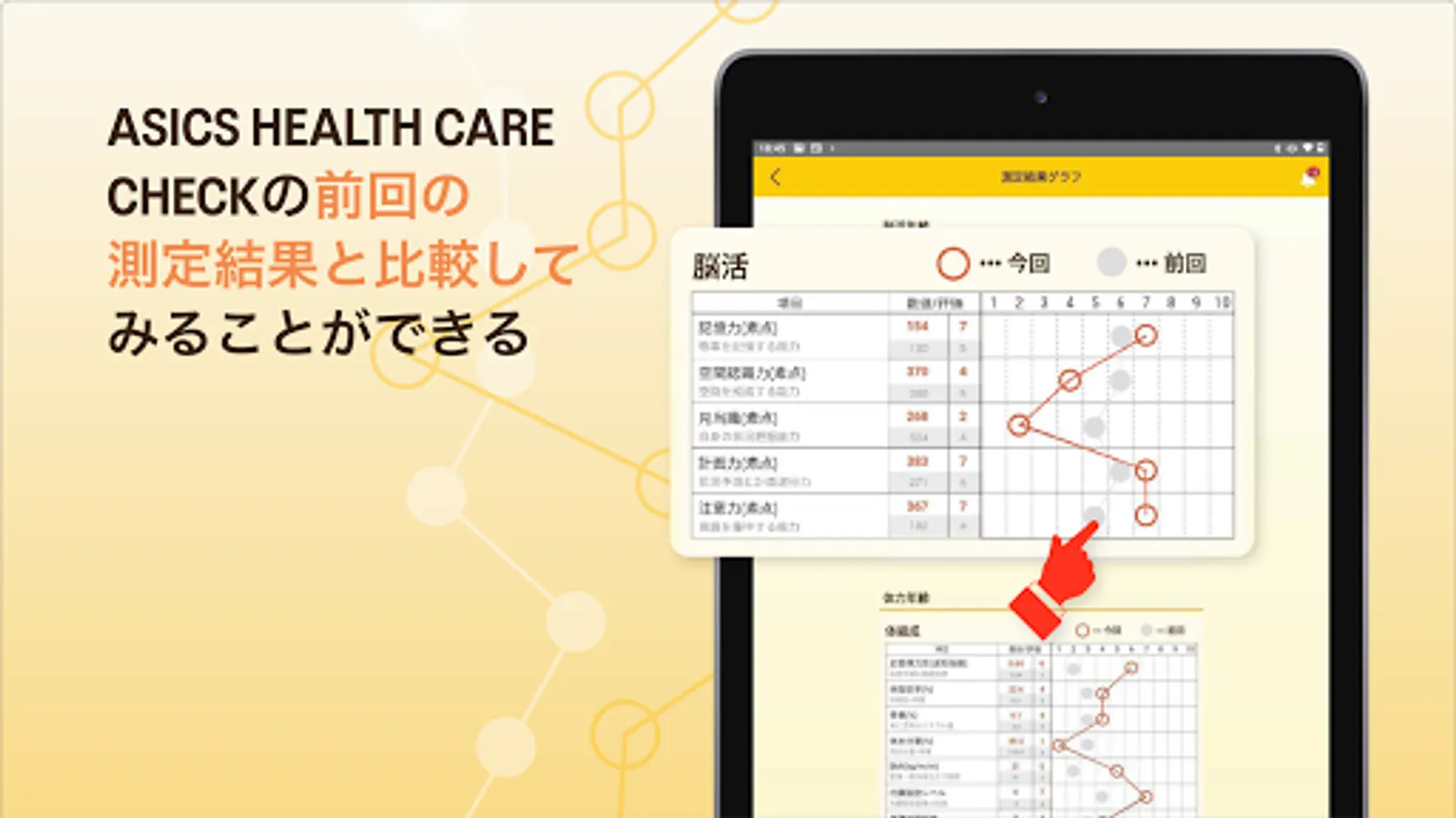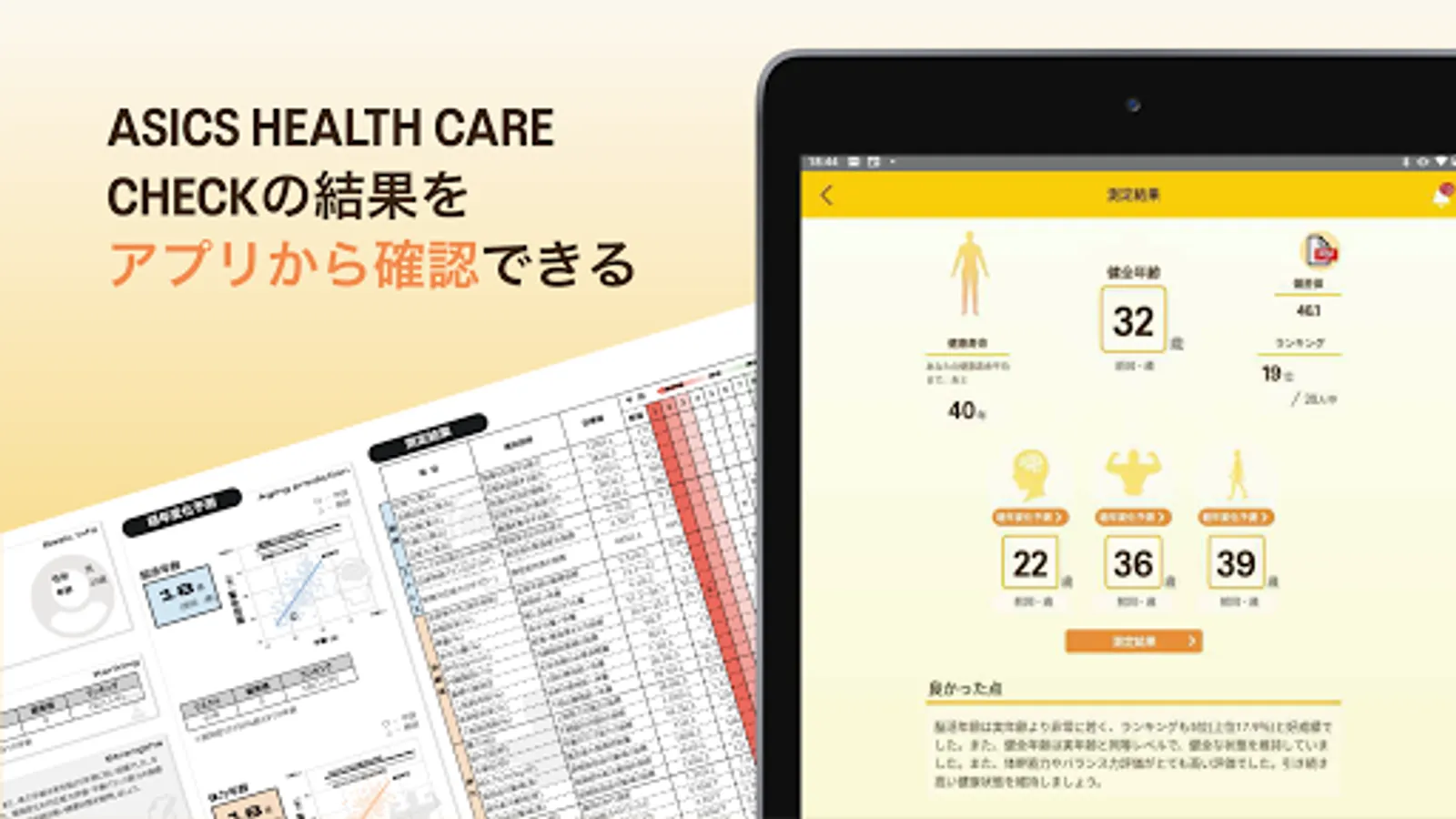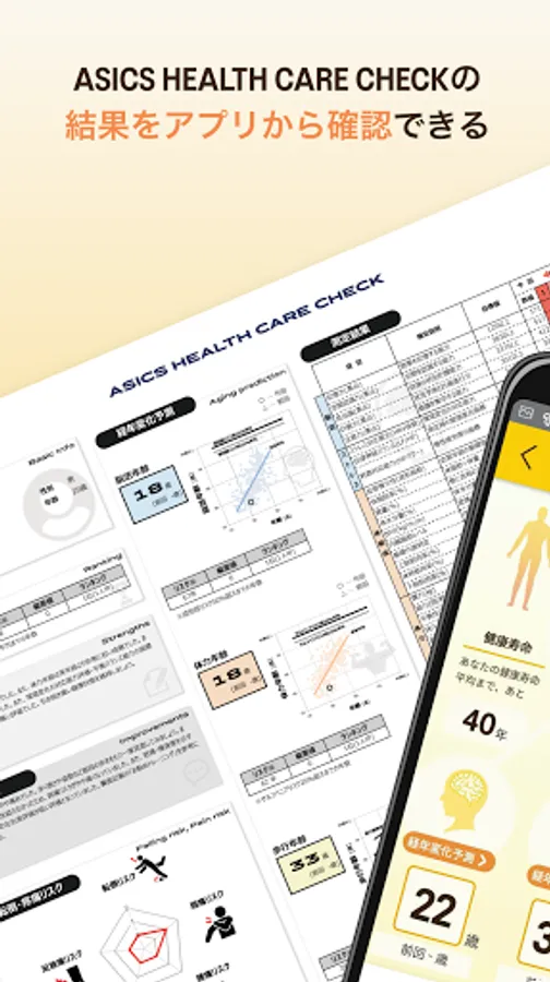 This app is for checking the measurement results of "ASICS HEALTH CARE CHECK" and promoting health improvement according to the results. ASICS HEALTH CARE CHECK is a measurement service that analyzes and evaluates the degree of physical and mental health based on scientific evidence from various data on human body and health accumulated abundantly at ASICS Sports Engineering Laboratory.