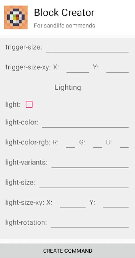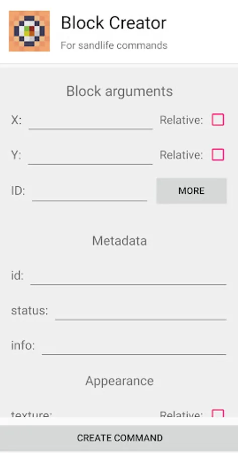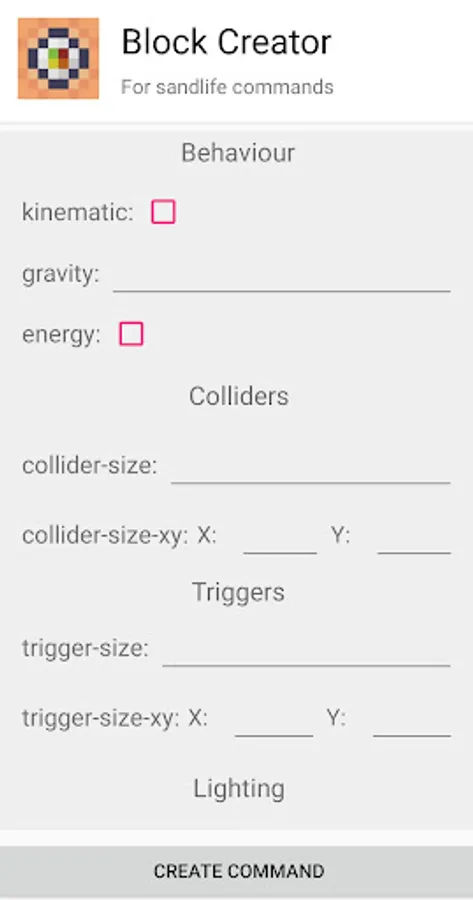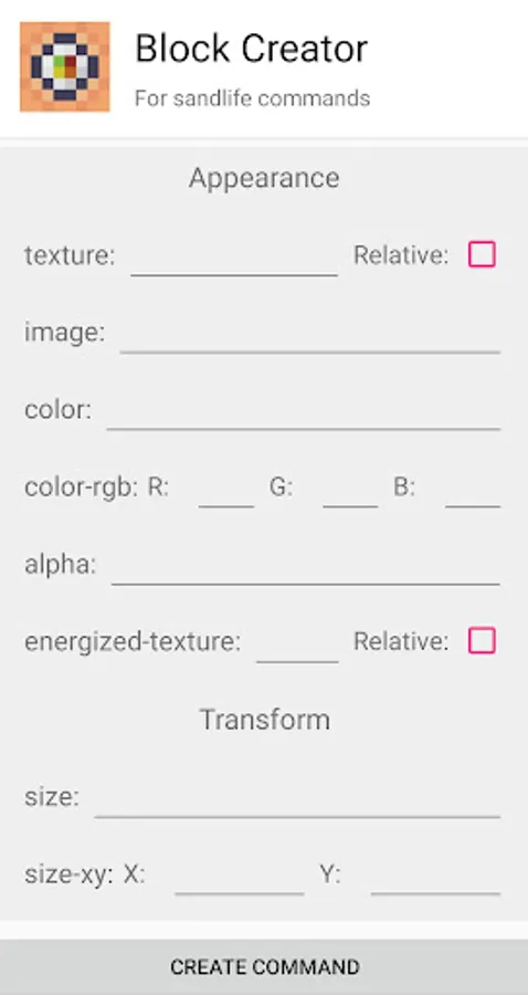 This app will give you the tools to create custom blocks for Sandlife. You only have to fill in the gaps to modify the properties of your block. It should be noted that the textures must be added separately to the game