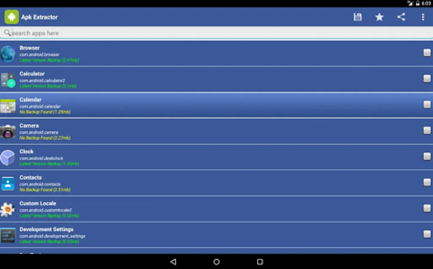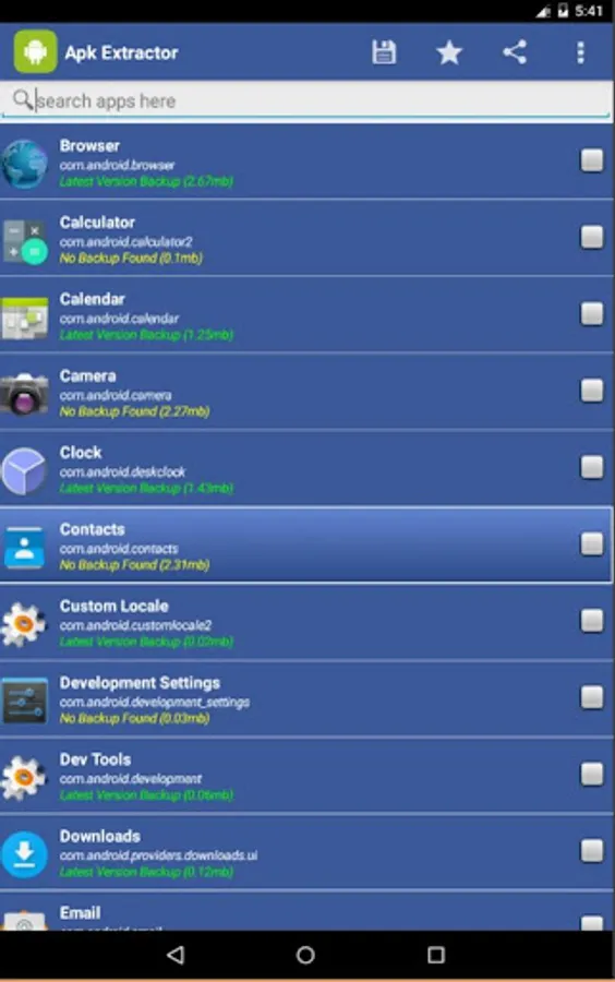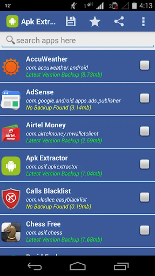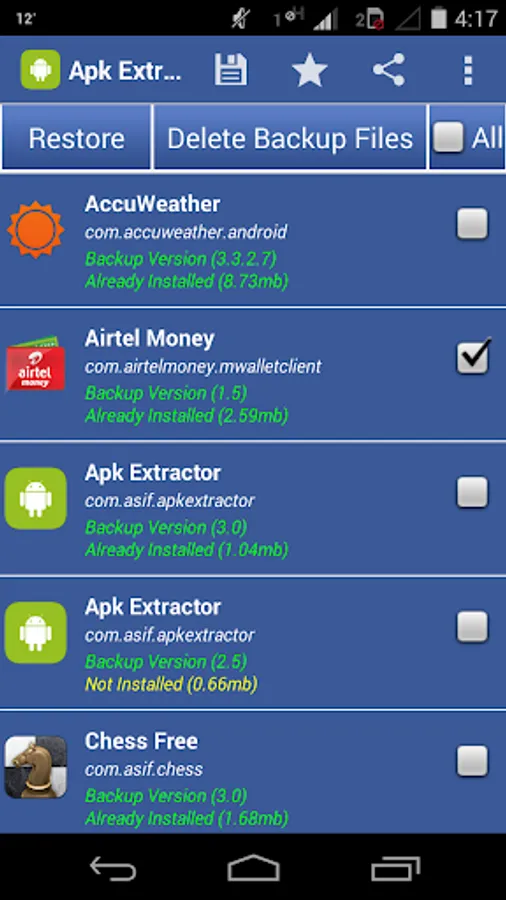 -App Name, App Icon, Size, Version, Package Name,Install/Backup Status