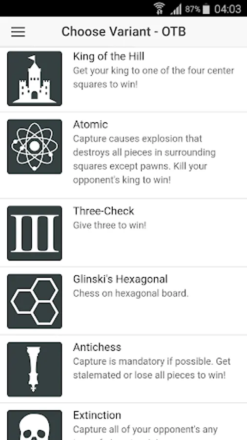 all of which can be played both over the board (OTB) with another person using a single device or online.