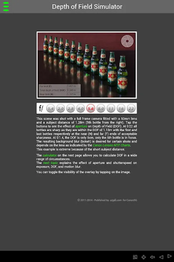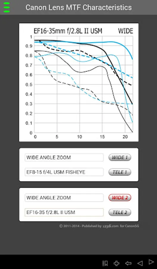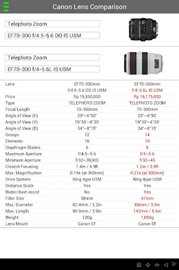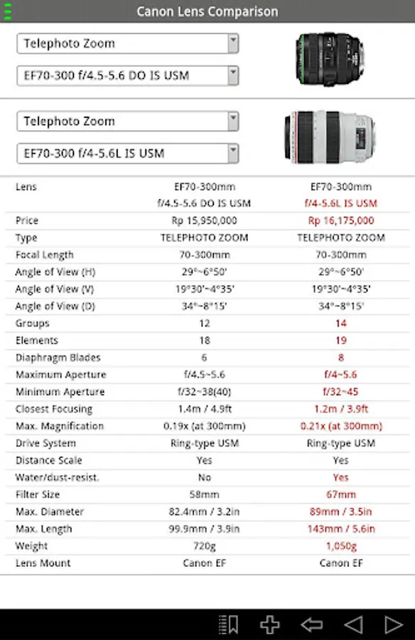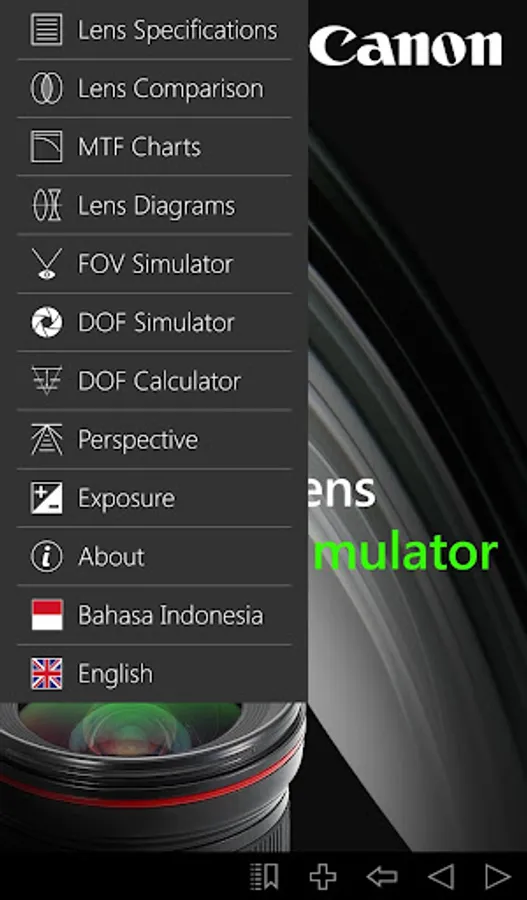 EF Lens Simulator is a free Canon App that features detailed lens specifications of all Canon EF, EF-S, and EF-M lenses sold in Indonesia. The application also contains a unique interactive simulator that allows you to compare the field of view of two camera-lens combinations whereby the cameras and lenses can be any Canon EOS digital SLR and lens.