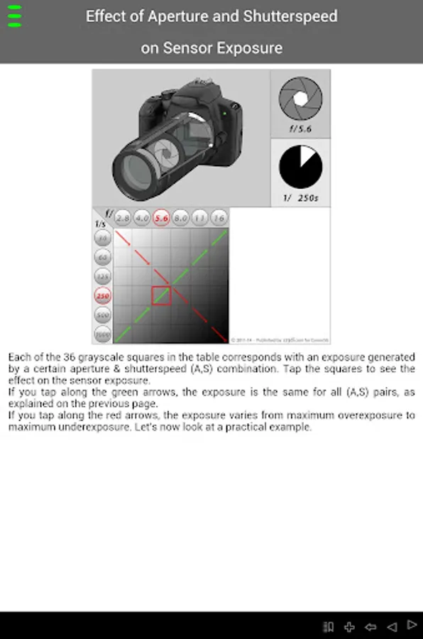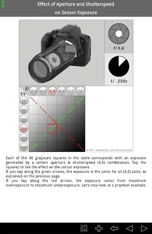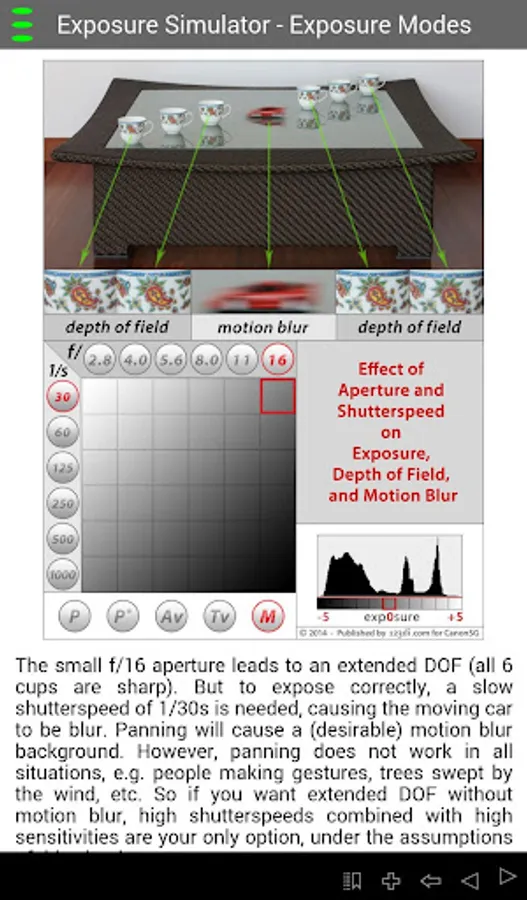* In-depth topic with interactive simulators explaining how aperture and shutterspeed affect exposure, depth of field, and motion blur in the various exposure modes.