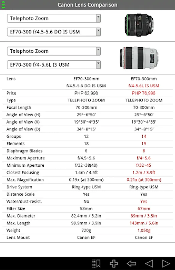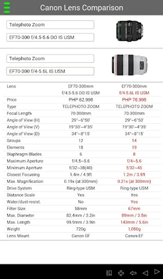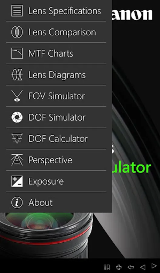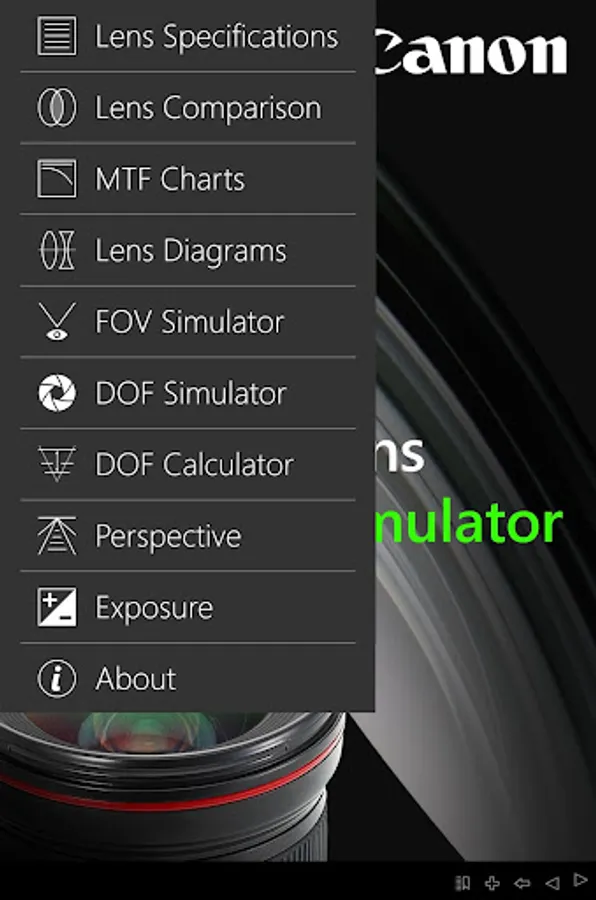 EF Lens Simulator is a free Canon App that features detailed lens specifications of all Canon EF, EF-S, and EF-M lenses sold in the Philippines. The application also contains a unique interactive simulator that allows you to compare the field of view of two camera-lens combinations whereby the cameras and lenses can be any Canon EOS digital SLR and lens.