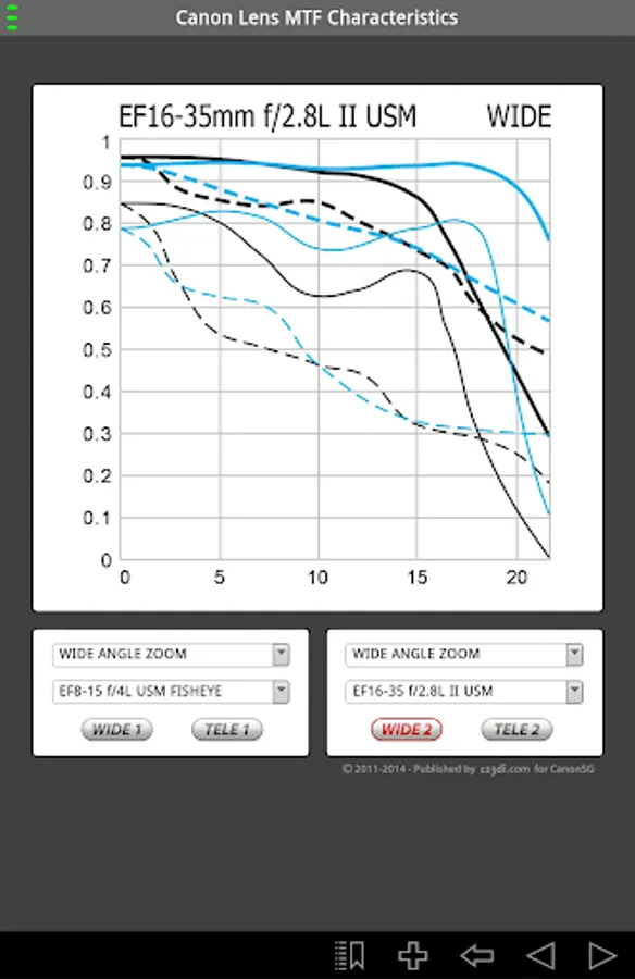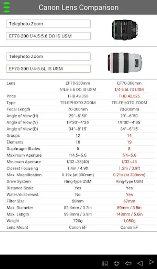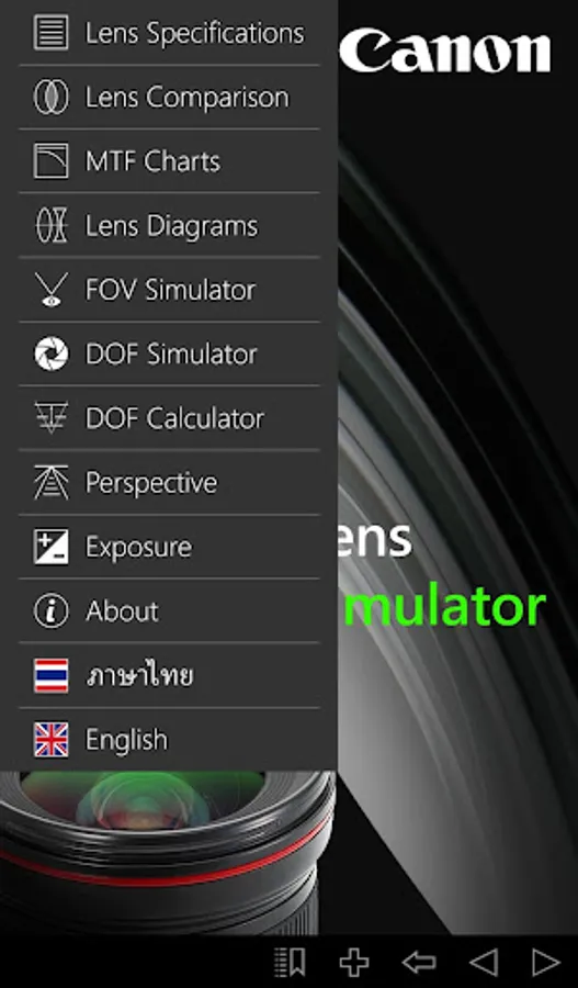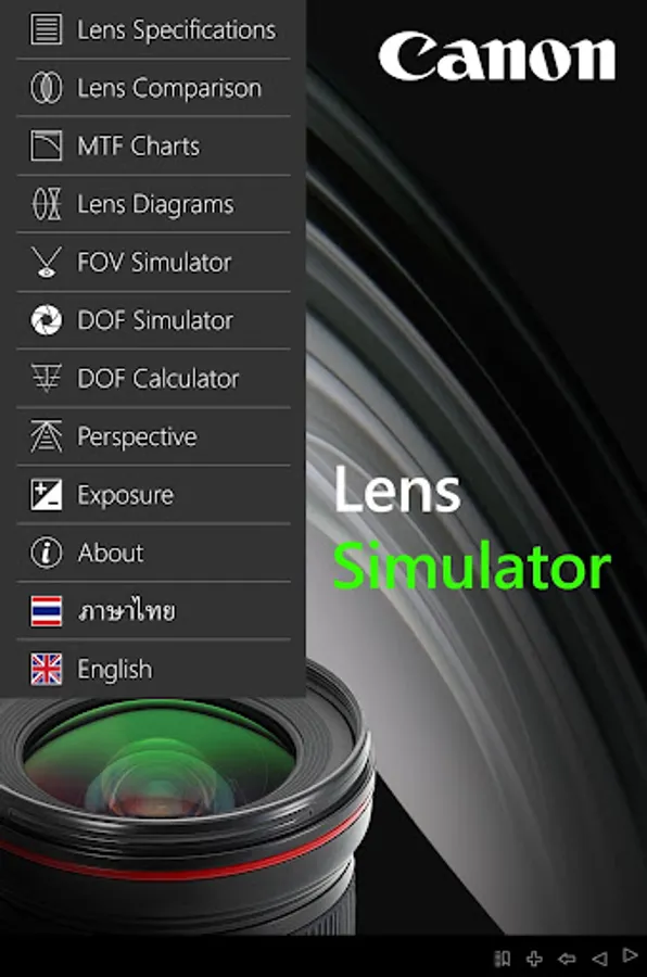 EF Lens Simulator is a free Canon App that features detailed lens specifications of all Canon EF, EF-S, and EF-M lenses sold in Thailand. The application also contains a unique interactive simulator that allows you to compare the field of view of two camera-lens combinations whereby the cameras and lenses can be any Canon EOS digital SLR and lens.