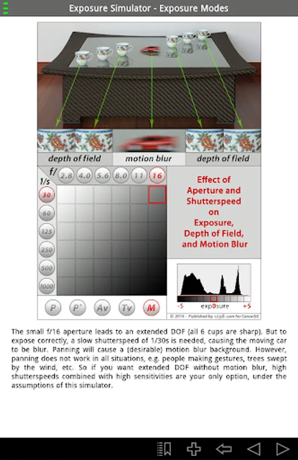 * In-depth topic with interactive simulators explaining how aperture and shutterspeed affect exposure, depth of field, and motion blur in the various exposure modes.