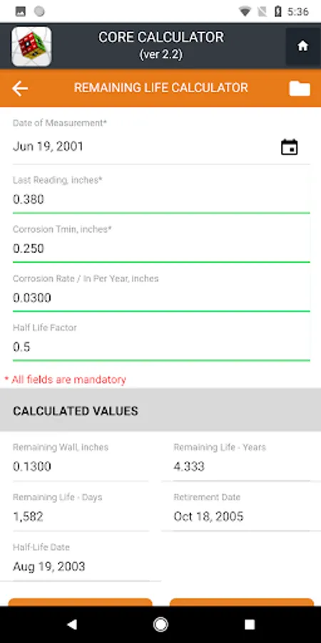 Quick and easy calculator to assist API 510/570 Inspectors in calculating Tmin, MAWP, corrosion Rates, and Remaining Life. The CORE Calculator App is designed to take common Inspection and Engineering calculations and make them available and accessible on your mobile device. The App is free and downloadable from the Apple App Store for iPhones and iPad devices.