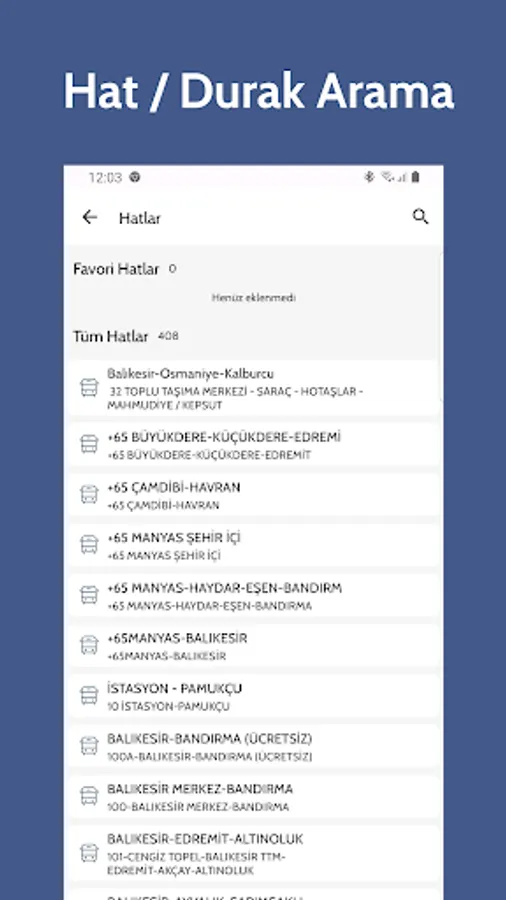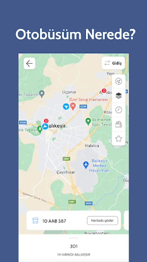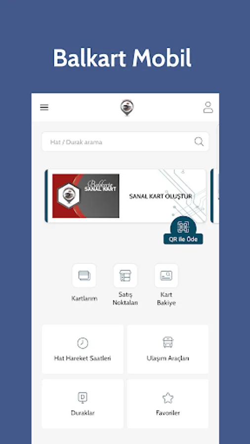 Application Functions: Where is my bus, Balance Enquiry, Balance Control, Tariffs, Line Movement Watches, Authorized Reseller and Card Center, Balance installation, contact, Favourites, There Complaints