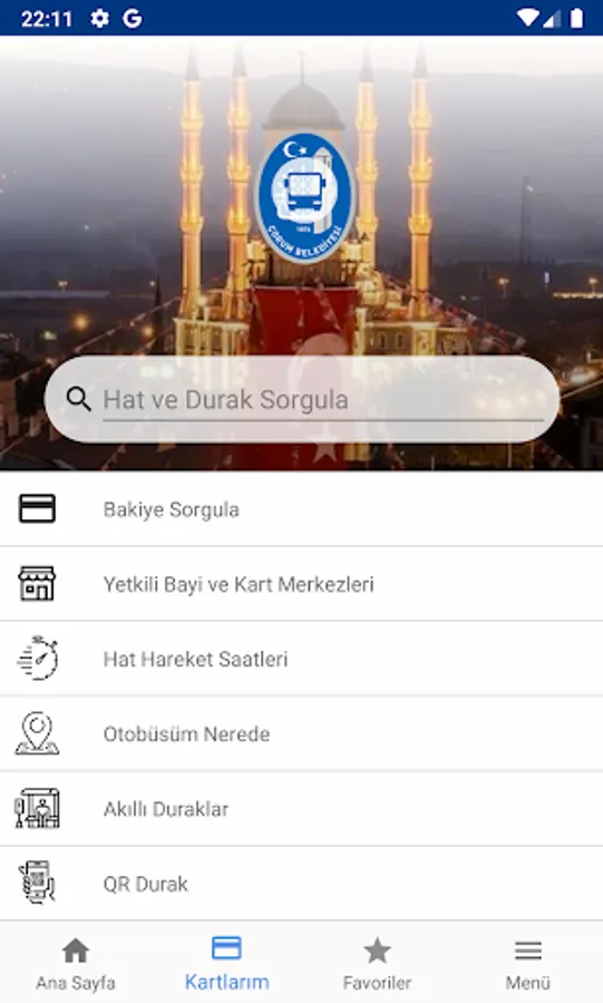 Application Functions: Where is my bus, Balance Enquiry, Balance Control, Fee Schedule, Line timetable, Authorized Reseller and Card Centers