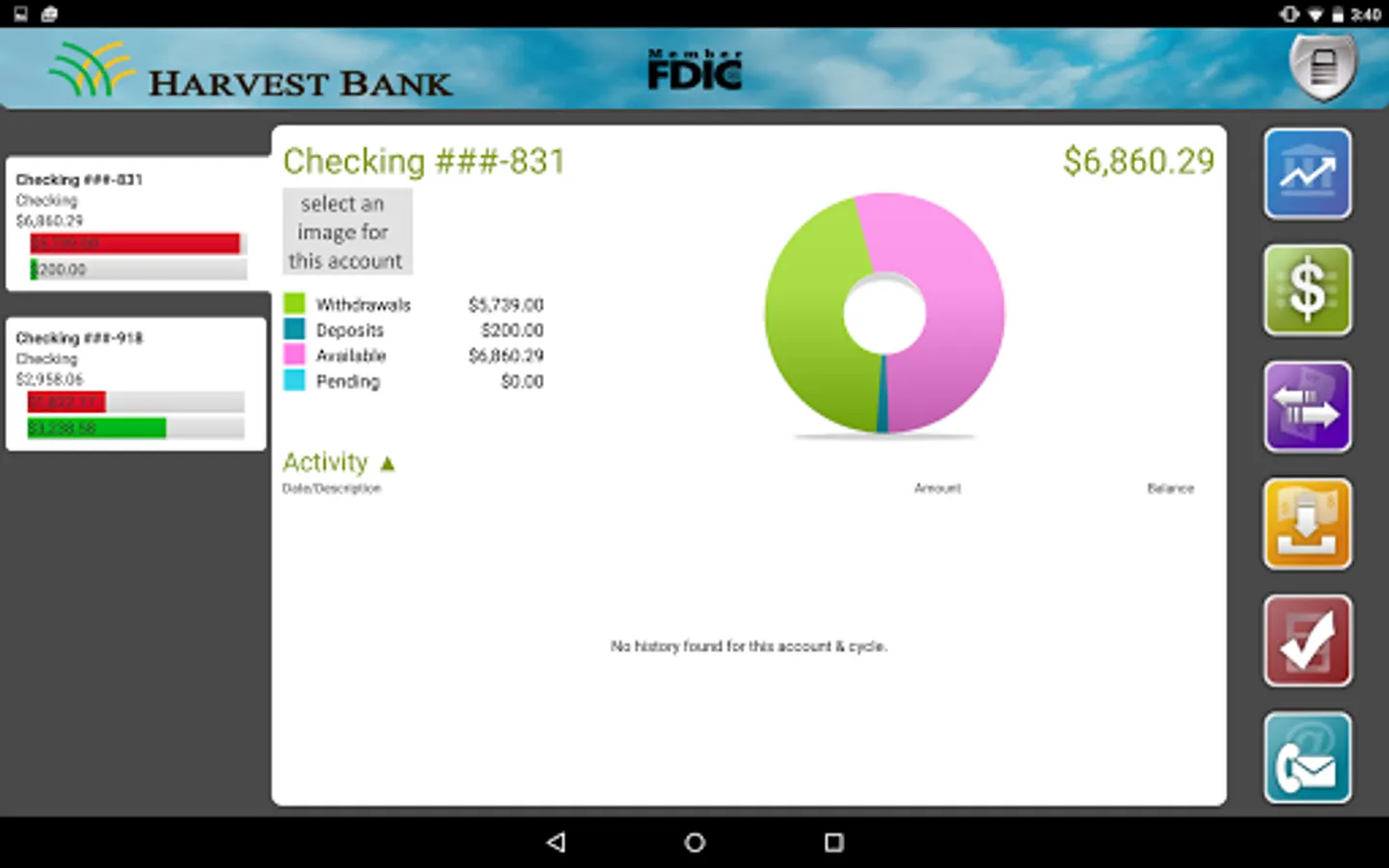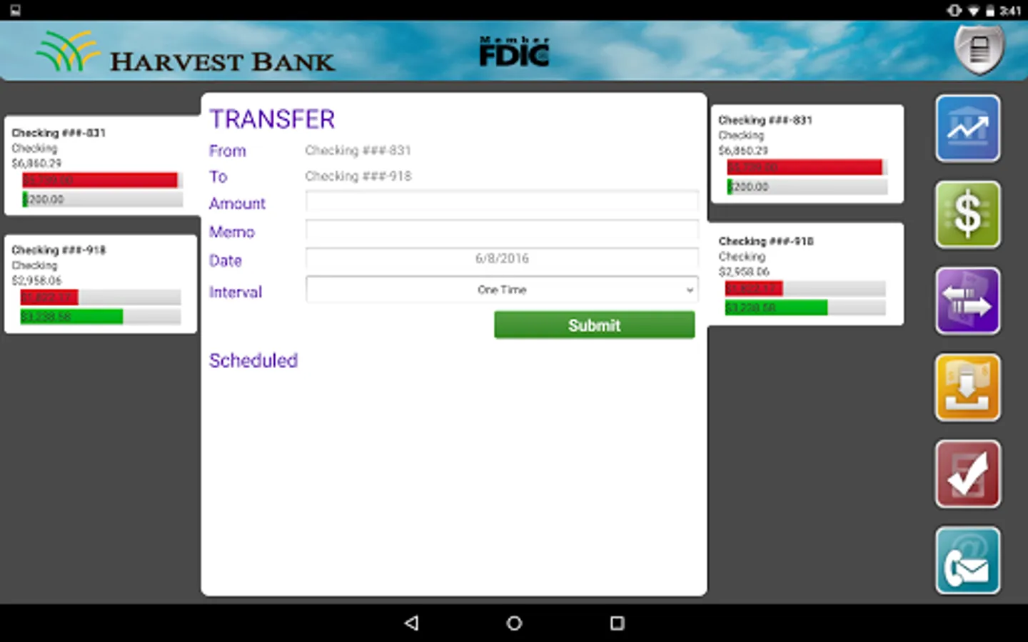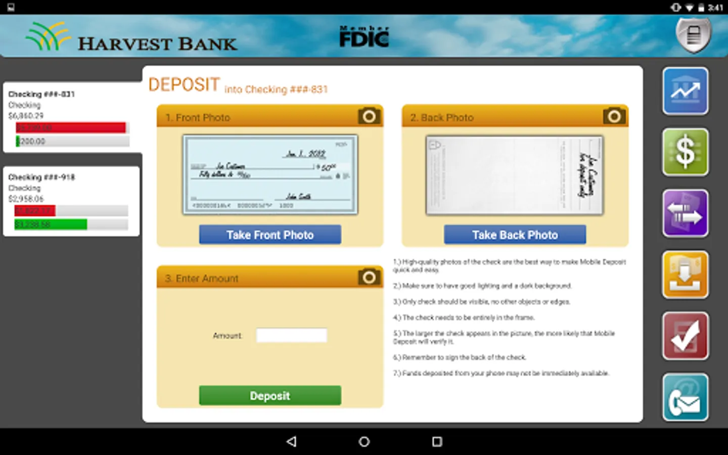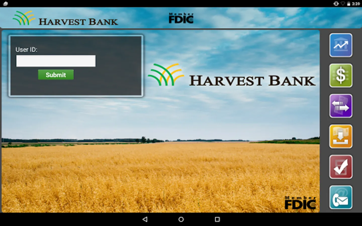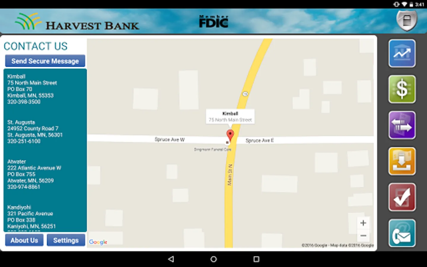 Harvest Bank of Kimball, St Augusta, Atwater and Kandiyohi mobile app provides access to the same accounts that are viewable in online banking. View account balances, view recent and pending transactions, transfer funds between accounts, deposit checks, and pay bills!