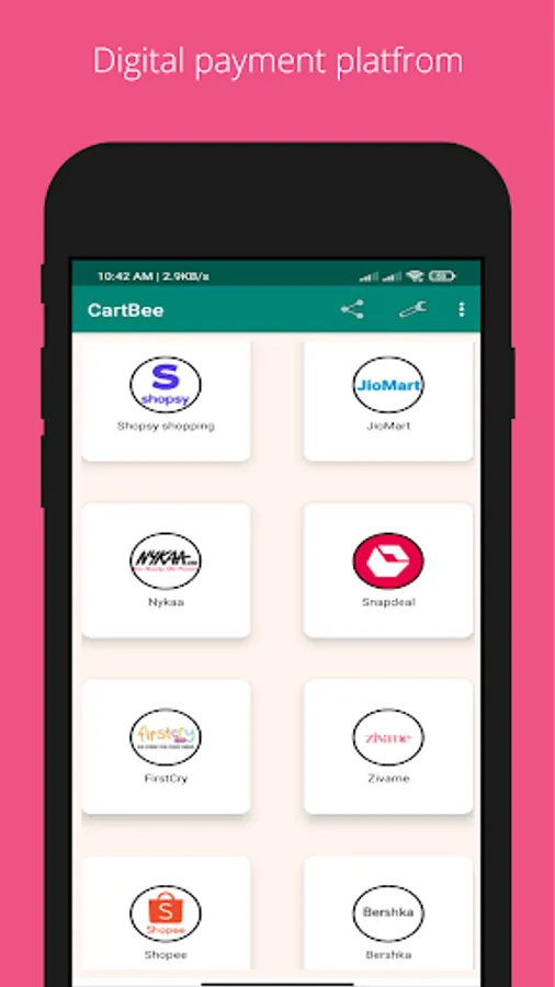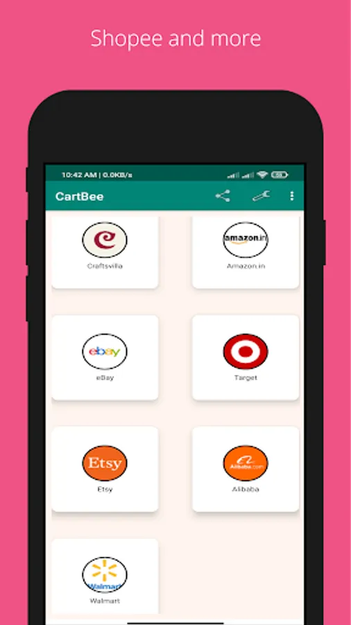 CartBee provide top shopping sites like Shopsy, JioMart, Nykaa, Snapdeal, FirstCry, Zivame, Shopee, Bershka, Craftsvilla, Amazon.in,eBay, Target, Etsy, Alibaba, and Walmart. Introducing 'Shopsy' - your ultimate shopping companion app! With Shopsy, you can discover, browse, and shop from a wide variety of online stores, all in one convenient platform on your Android device. With a user-friendly interface and seamless navigation, Shopsy makes it easy to find the products you love. Explore an extensive range of categories, from fashion and beauty to electronics, home decor, and more. Discover the latest trends, exclusive deals, and popular brands, all at your fingertips. Enjoy a personalized shopping experience with Shopsy's tailored recommendations based on your preferences and browsing history. Stay updated with new arrivals, seasonal sales, and limited-time promotions to never miss out on the best deals. Experience the ultimate convenience of browsing and shopping from 15 renowned online retailers, including Shopsy and many more, all within a single Android app. With CartBee, discover a world of shopping possibilities at your fingertips. Unleash the power of 15 top-rated shopping sites, offering a vast range of products from fashion, electronics, home decor, beauty, and beyond. Say goodbye to juggling multiple apps and websites, as CartBee brings them all together in a seamless, user-friendly interface. Shop with confidence as you explore the latest trends, exclusive deals, and a diverse array of brands. Whether you're hunting for stylish clothing, must-have gadgets, or unique gifts, CartBee ensures you'll find exactly what you're looking for.
