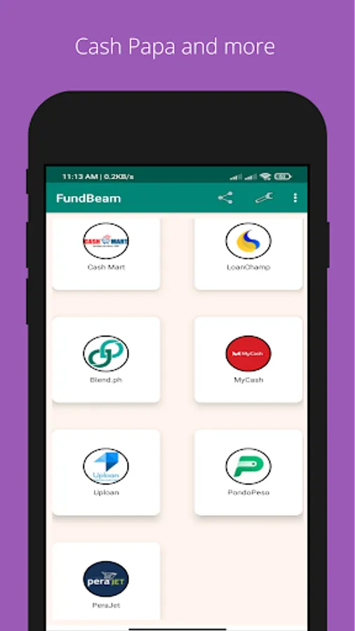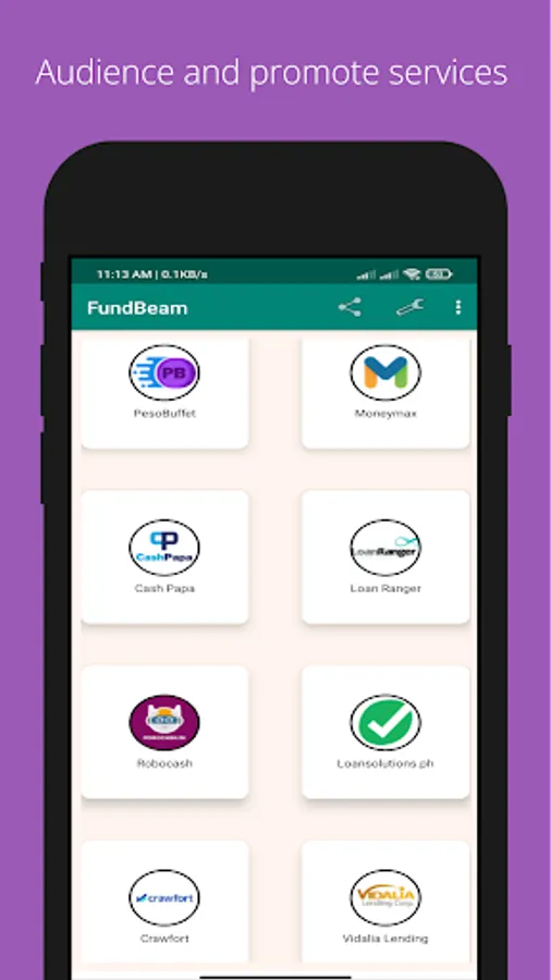 FundBeam provide top financial service sites like PesoBuffet, Moneymax, Cash Papa, Loan Ranger, Robocash, Loansolutions.ph, Crawfort,Vidalia Lending, Cash Mart, LoanChamp, Blend.ph ,MyCash, Uploan ,PondoPeso and PeraJet. PesoBuffet you'll discover an innovative online platform that offers a range of financial services and solutions tailored to meet your needs. With a commitment to empowering individuals with financial knowledge and tools, PesoBuffet Tech aims to enhance your financial well-being and help you achieve your goals.PesoBuffet Tech provides valuable resources and educational content to improve your financial literacy. From budgeting tips to investment strategies, you can access comprehensive information that will guide you towards making informed financial decisions.One of the key features of Peso Buffet Tech is its investment platform, where you can explore various investment opportunities and grow your wealth.  Introducing FundBeam' – Your Ultimate Financial Services Companion! Simplify your financial management with this native Android app that brings together the power of 15 leading financial service platforms, including PesoBuffet and similar sites, in one convenient place. It is your go-to app for seamless access to a wide range of financial services, all at your fingertips.With FundBeam, you can effortlessly navigate through a diverse array of financial services, all within a single app. Whether you need quick cash loans, credit cards, investment opportunities, or personalized financial advice, FundBeam has you covered.