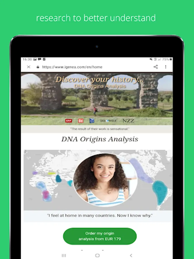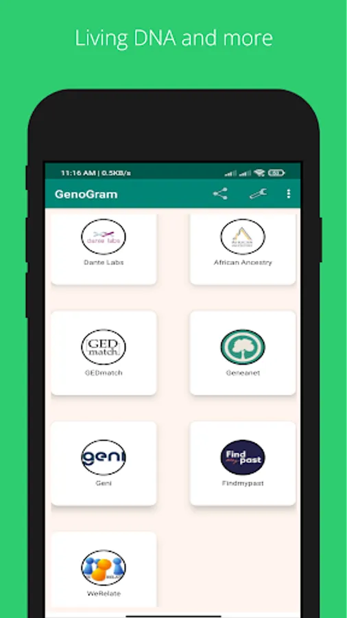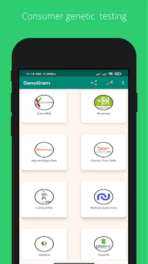 Introducing GenoGram, the ultimate companion app for genetic exploration! With this app, you can easily access and compare the services of 15 leading DNA Genetic Testing sites, including renowned platforms like 23andMe, all in one convenient location. Whether you're curious about your ancestry, interested in uncovering potential health risks, or simply fascinated by genetic traits and wellness information, This app has got you covered. Our user-friendly interface allows you to seamlessly navigate through the various testing sites, providing comprehensive reports on ancestry composition, carrier status, genetic health risks, and much more. Dive into your genetic heritage and gain invaluable insights into your biological identity with GenoGram.Discover your roots, make informed health decisions, and embark on a journey of self-discovery like never before.