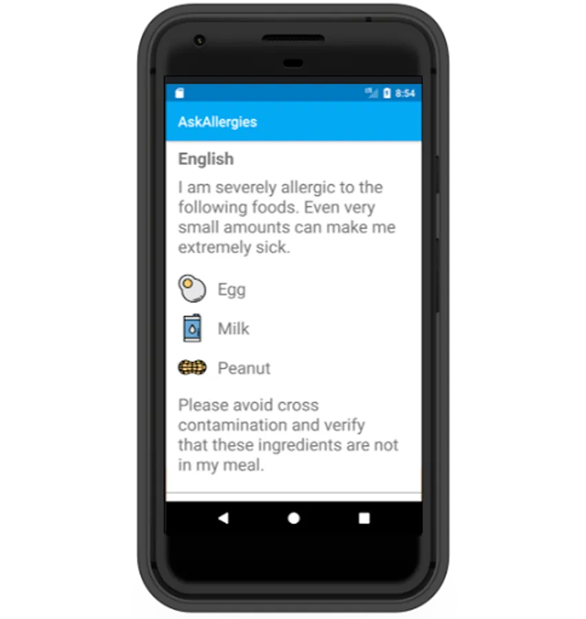 Download the app, tell us which foods you want to avoid and you'll instantly receive a free digital allergy card in one of our supported languages.