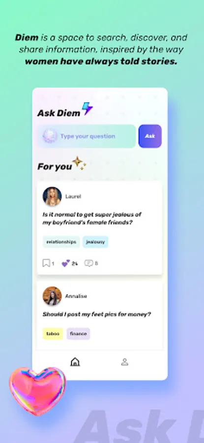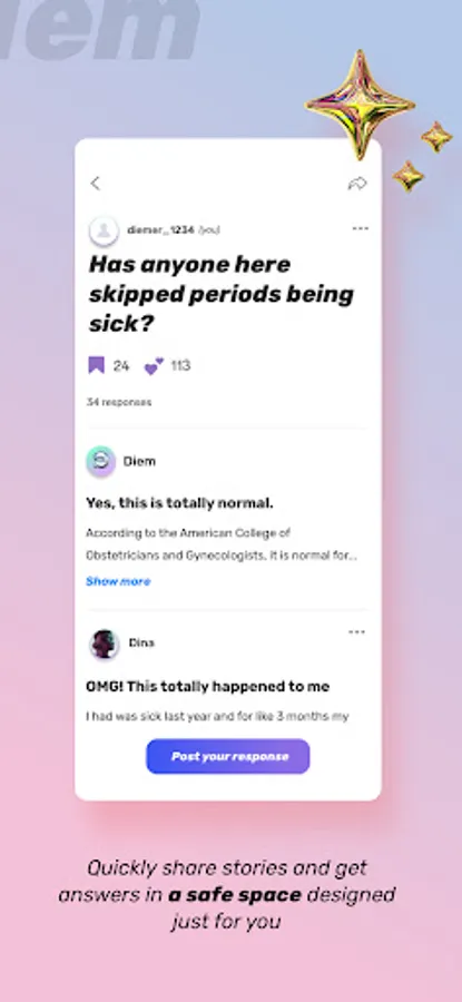 We built Diem to scale those candid conversations by embracing them instead. Our aim is to turn these conversations that happen "behind closed doors" — whether they're about friendships, birth control, toxic masculinity, harassment, chronic pain, big career moves, enthralling books, easy recipes, and everything in between — into public and credible resources.