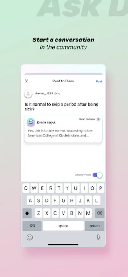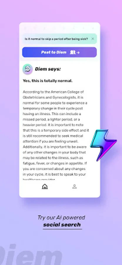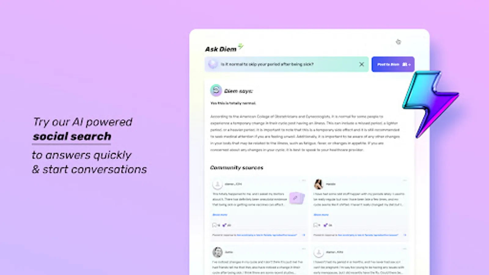 To do this, we’ve built a model called Diem AI to conversationally answer your pressing, personal, embarrassing, funny, and serious questions. The model combines an LLM with our own community data. When you ask Diem a question, you’ll first receive an AI-generated response that scrapes Diem (and the internet) for answers (through a feminine lens) and then supplements those results with real-life anecdotes from Diem community members. The more we collectively share, the better the experience gets for everyone! You can think of Diem as a Q&A sesh that’s similar to searching the internet but with a built-in network of trustworthy internet friends.