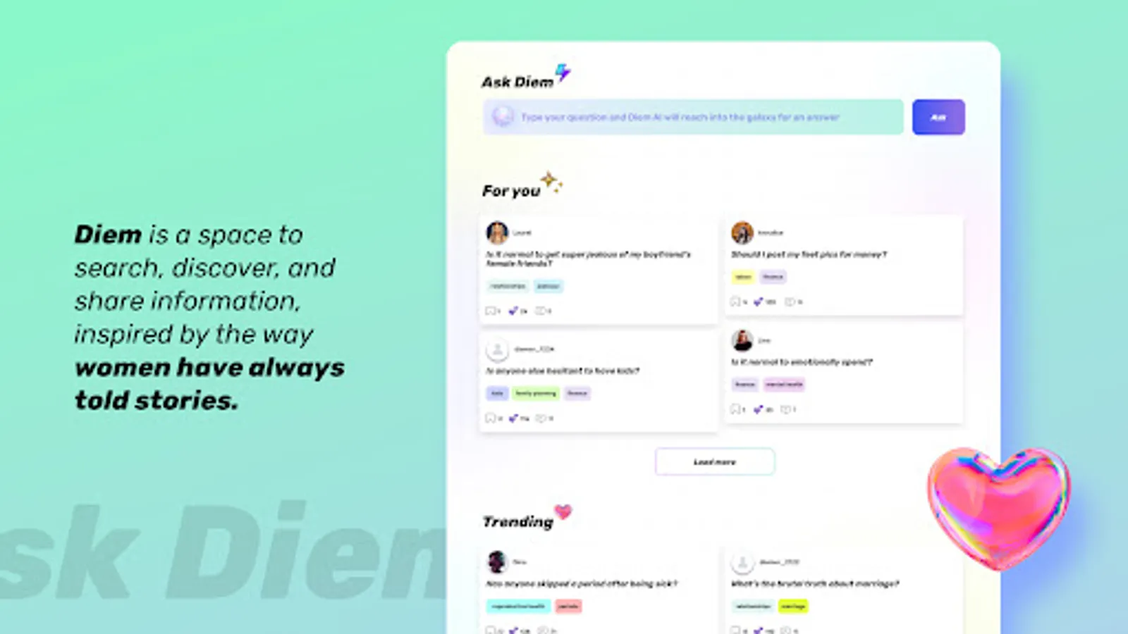 Diem is a social search engine, inspired by how women have shared knowledge for centuries. It's a dedicated, privacy-first space for people to search, collect, and share information with each other.
