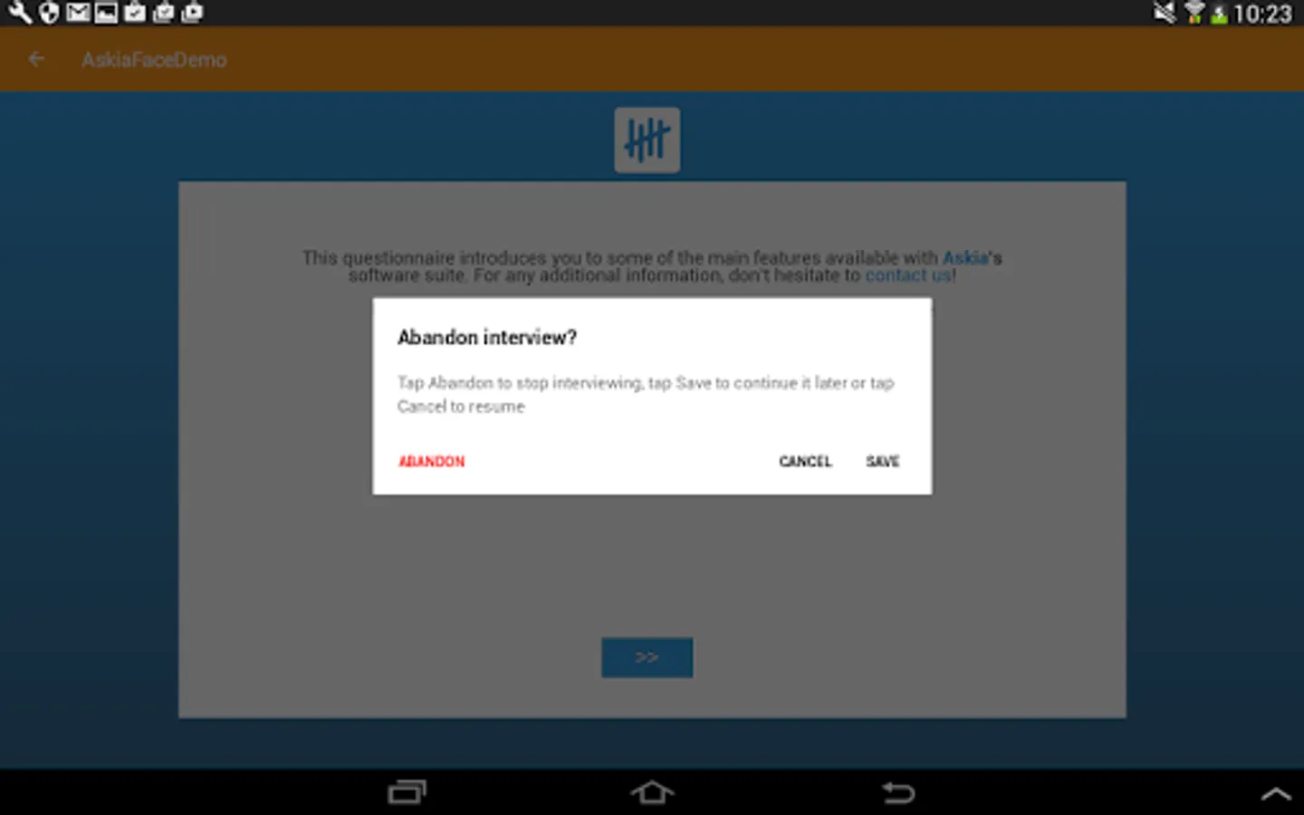 - Full integration: askiaface for Android links seamlessly into other Askia products giving you advanced survey design features and effective fieldwork management.