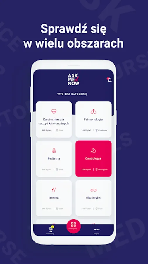 The Ask med now application is a solution dedicated to medical professionals: doctors, pharmacists, nurses, students. The application is based on the idea of duels between players. Registration in the application is quick and simple. The fight begins by choosing a category, after which each player must indicate the correct answer to six questions. The whole is a loose duel, in which the player gains subsequent levels in the application structure. The application is designed to expand the user's knowledge about a selected area of medicine / pharmacy in a light and pleasant way.