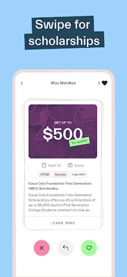 Take our quiz to find the scholarships you have the best chances of winning. Match with scholarships for your major, GPA, interests, and more--then swipe to save your favorites in the app.