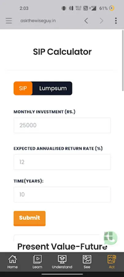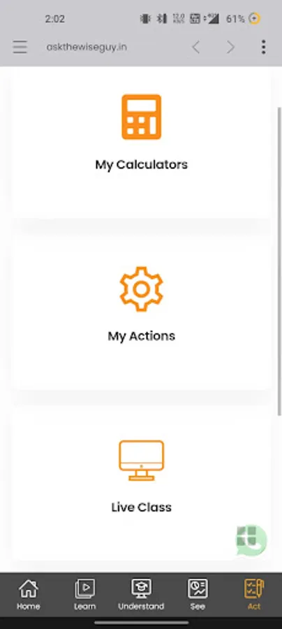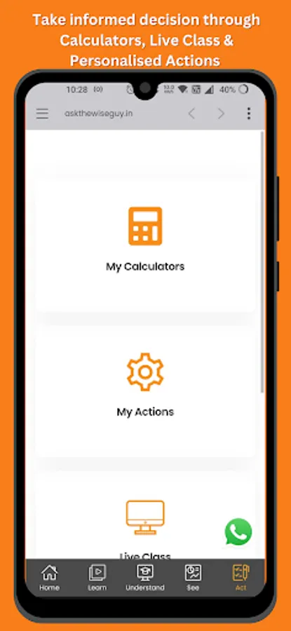 Act: The most important aspect is getting results that are based on your actions. This section has 3 types of calculators, personalized action points, a link to attend our LIVE Wise Webinars & a link to book meetings with our experts.