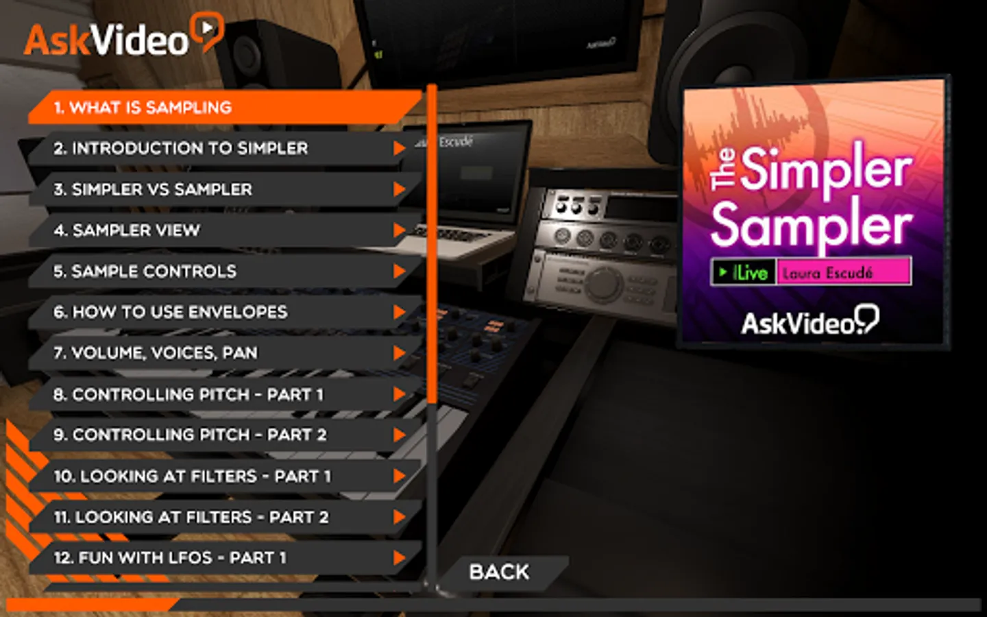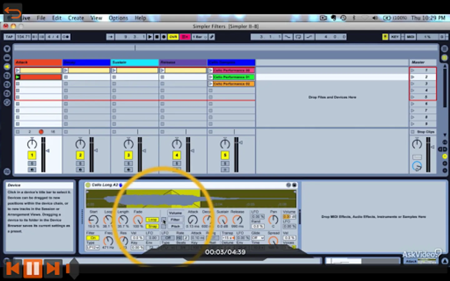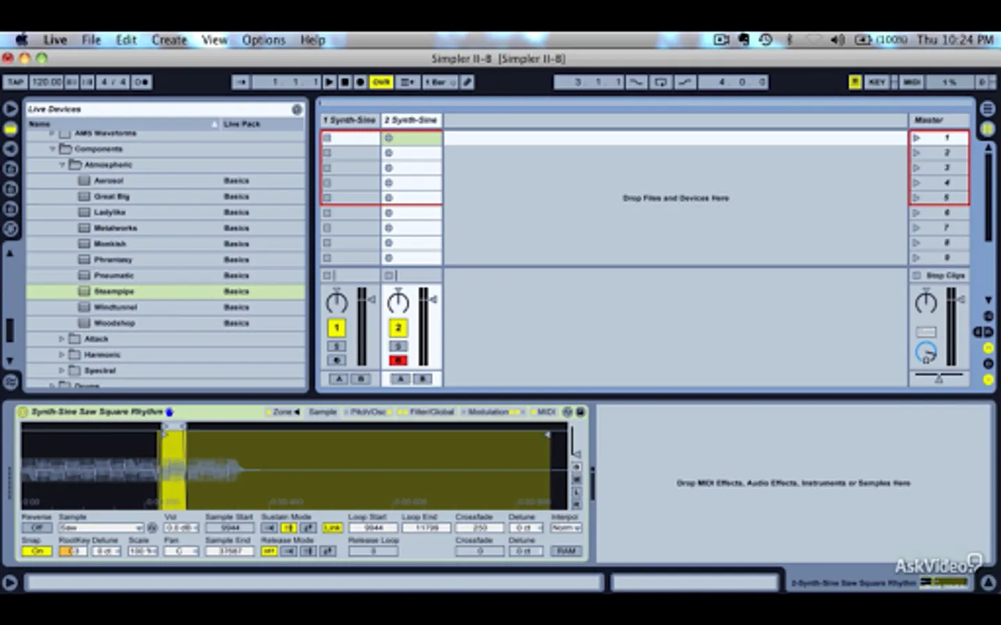 From there you're off to a zoomed-in, zoomed-out look at the Simpler Plugin that is included with every copy of Live. Laura takes you through all of Simpler's parameters from envelopes to LFO's showing you how they work and how she uses them in her music. She discusses the differences between Simpler and Live's premium instrument, Sampler ... and also shows you how they work together!