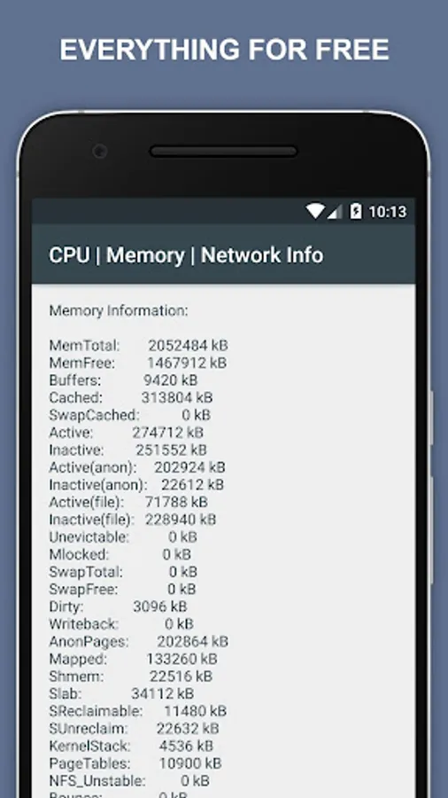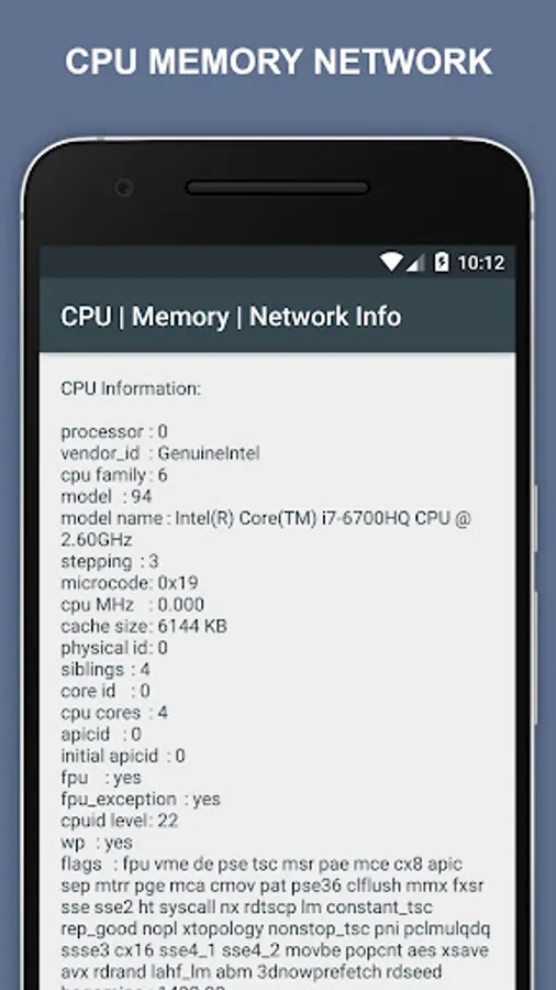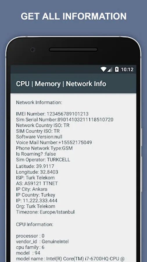 CPU | Memory | Network Info is a tool that allows users gather cpu network and memory information.You can find out your imei number , cpu speed , cpu model ,processor model , your ip adress , latitude , longitude and various informations in this app.Totally free and easy to use.
