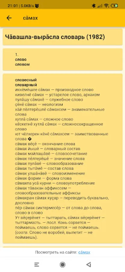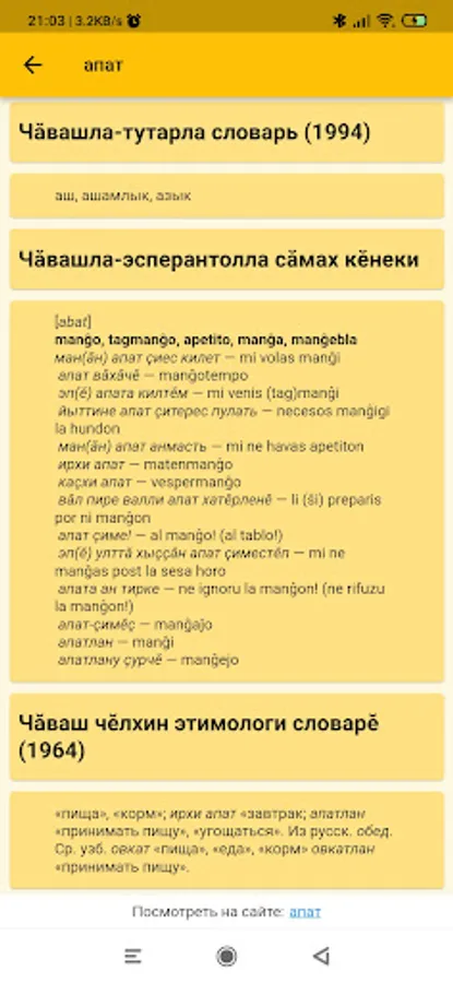 The appendix contains translations from Chuvash into Russian, Tatar, Esperanto languages. Descriptions of words in other language dictionaries of the Chuvash language.