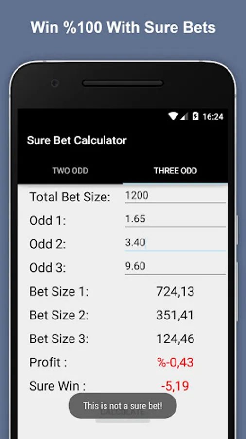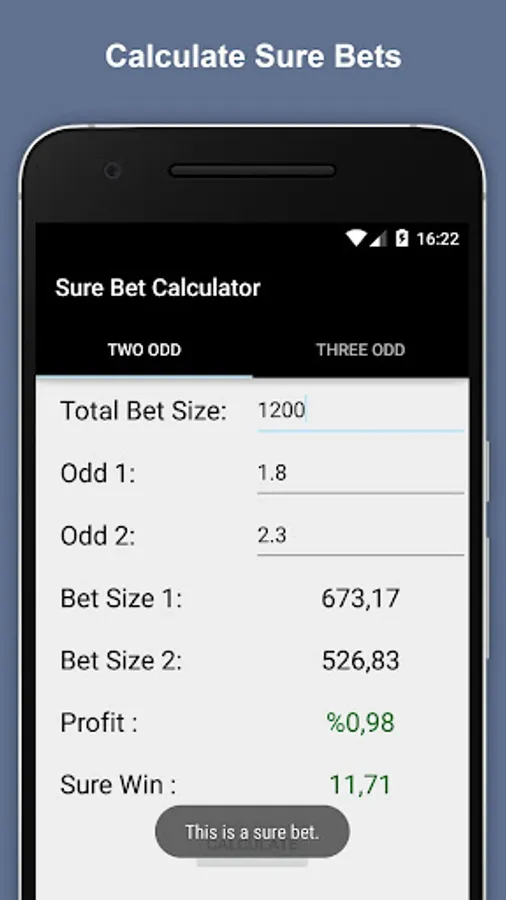 Sure Bet Calculator is a helper tool for people who likes to analysis their bets. With Sure Bet Calculator you can analysis 2 and 3 odds bets and see if they are sure betting tips. This app designed for arbitrage betters and if you are a arbitrage better this app is very usefull for you. You can check if there is sure bet very easy and fast. Just enter odds and see the result very fast.