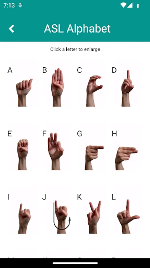 - Forget how to sign a letter? The ‘alphabet’ page shows you each letter from multiple perspectives, including common variations.