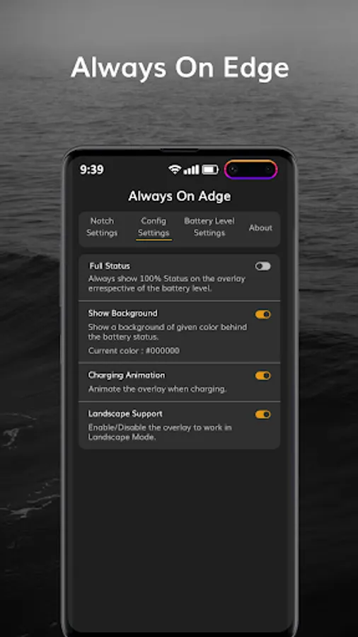 Energy Notch - Notch Battery Bar & Battery Indicator is an app which creates an overlay around the Notch of your device in order to indicate the current battery level. It works without needing any root access, and it has a high level of customization!
