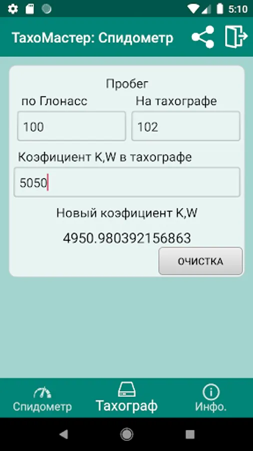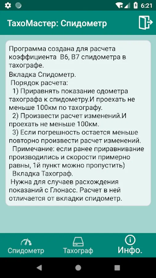 The program is designed for tachograph workshops to calculate the speedometer coefficient B6, B7 in the tachograph.