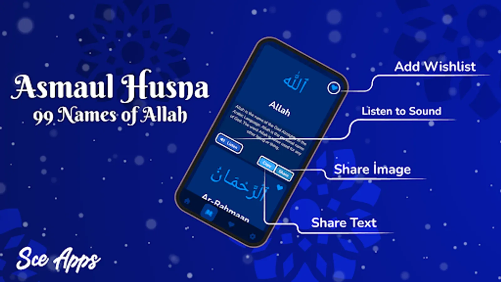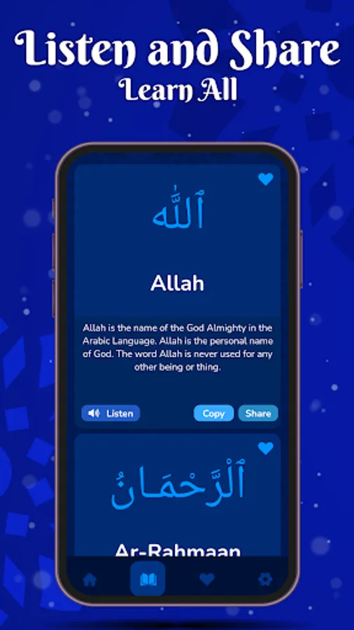 • You can listen to, share as text and share as visual the explanations of all 99 names of Allah.