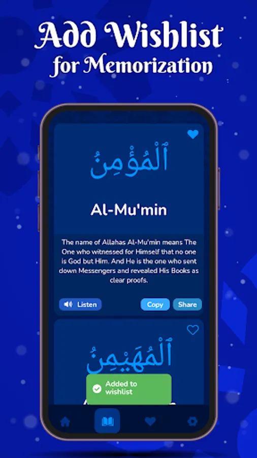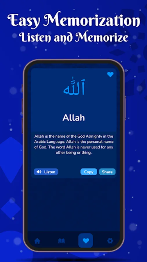 • Share Allah's names on WhatsApp, Instagram, and Facebook with the visual sharing feature.