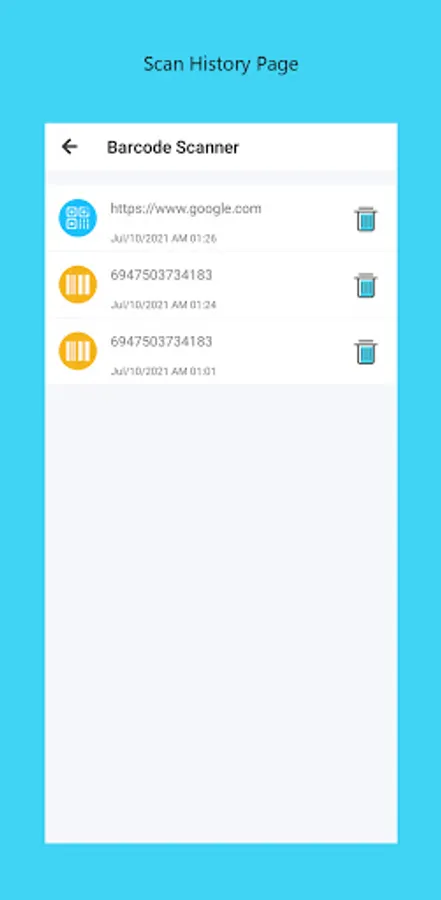 3. Click History on the homepage to view all scan codes, including QR & Barcode scan records selected from the album