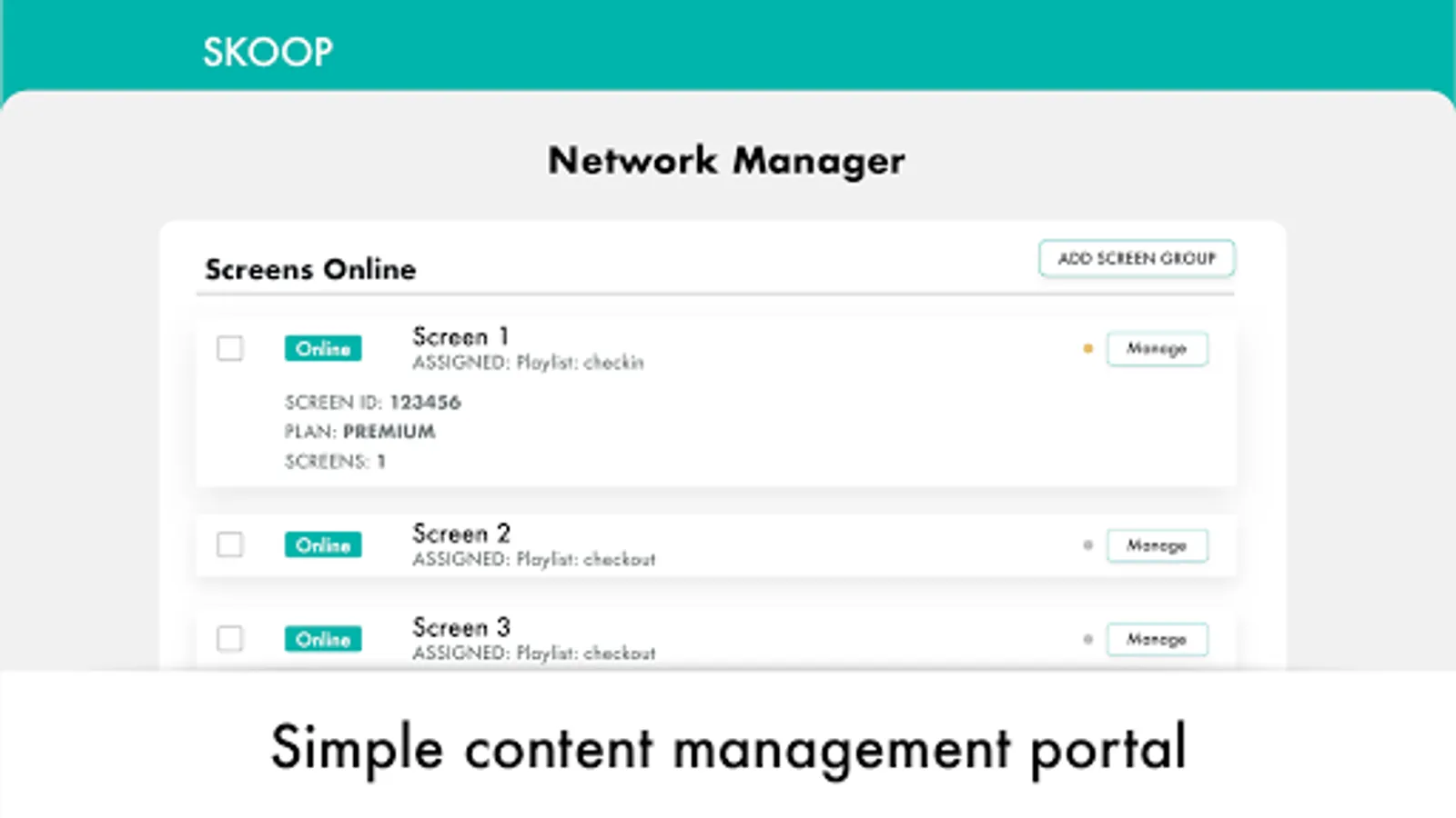 SKOOP Signage is an Amazon Fire TV Stick app, allowing customers to wirelessly turn any screen into a digital billboard. This plug and play solution enables screen owners to update content and see real-time updates to their dedicated screens.