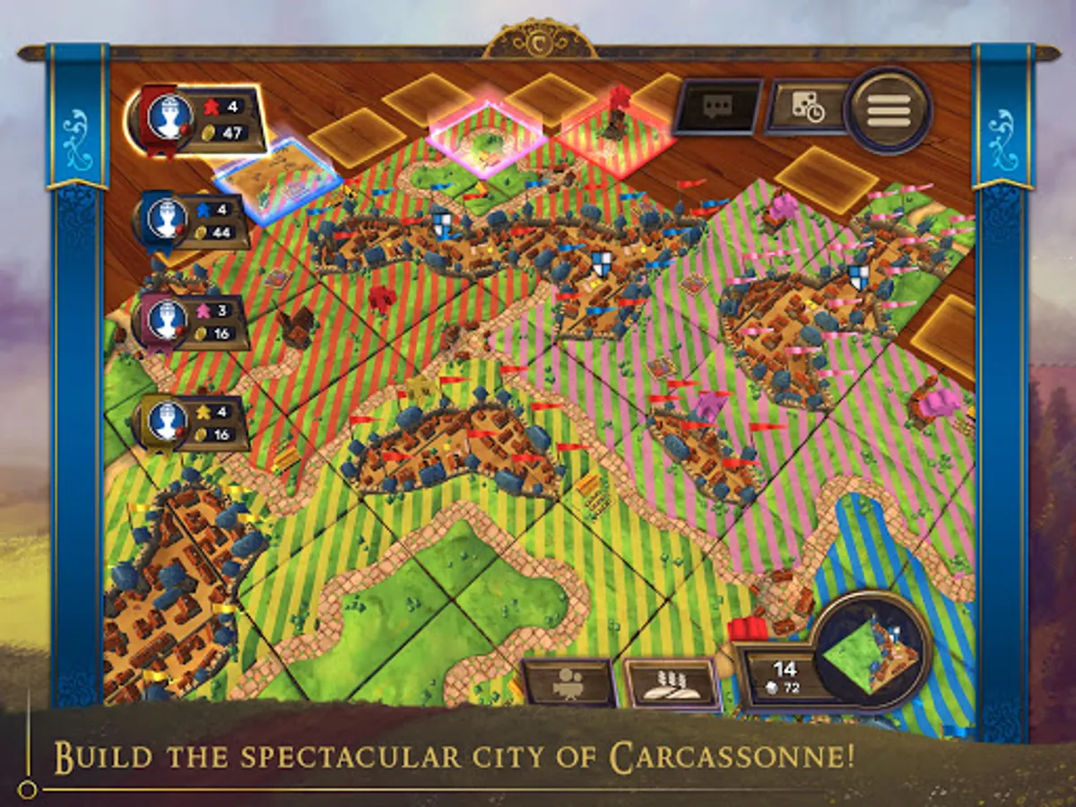 Discover or re-discover Carcassonne, the multi-awarded tile-based game in which players draw and place their tiles to build a medieval city. Place your cities, roads, abbeys or fields to enlarge your landscape, then place your followers, the meeples. Knights, robbers or farmers... Each meeple will help you control your territory and win points.